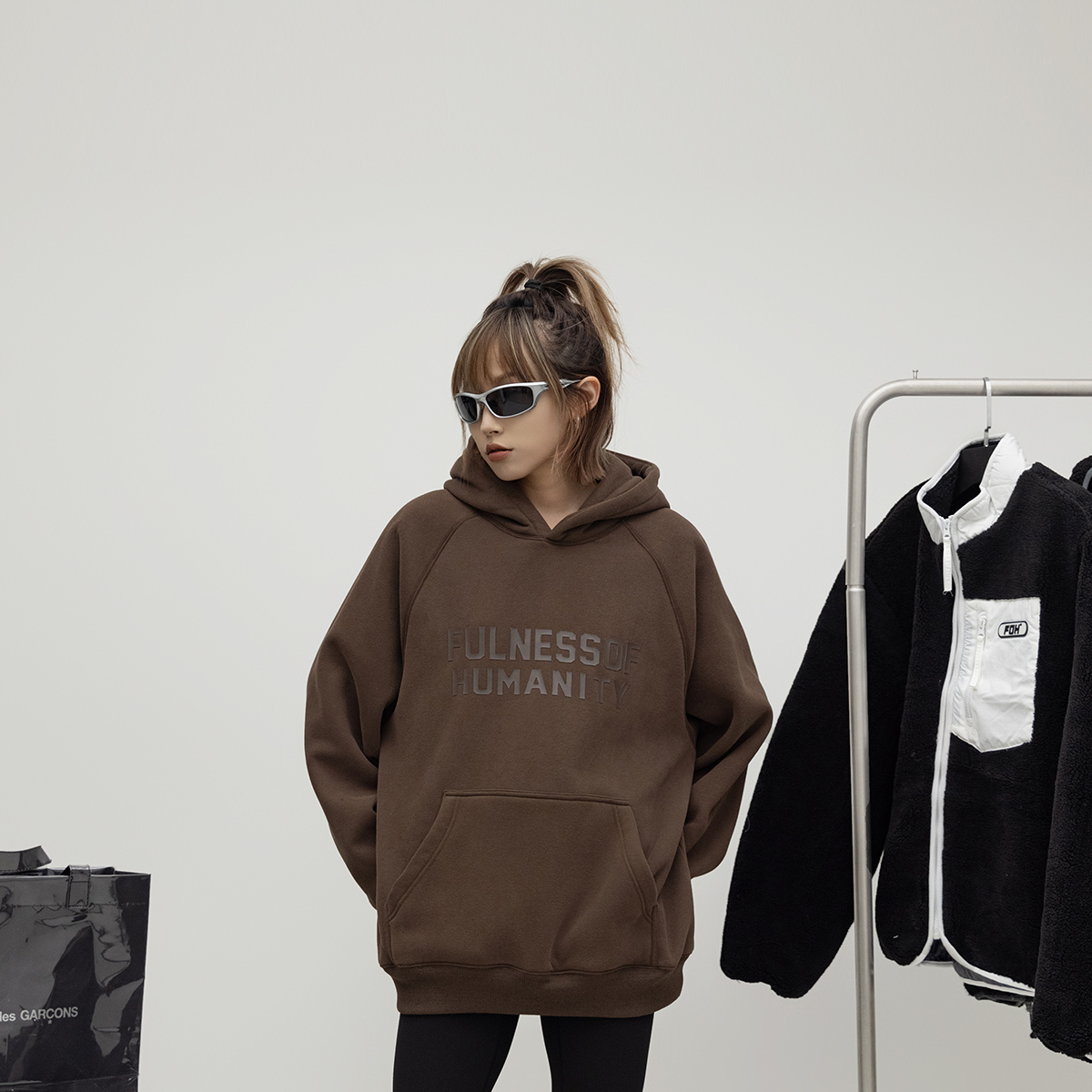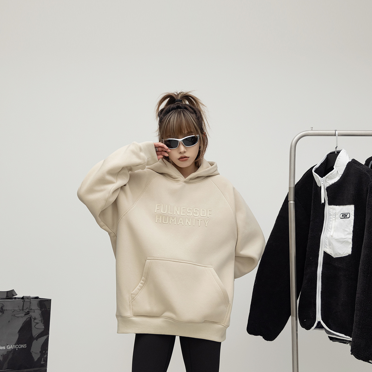 ONE PASS 380g重磅厚板胶印字母插肩袖加绒连帽卫衣女春季上衣