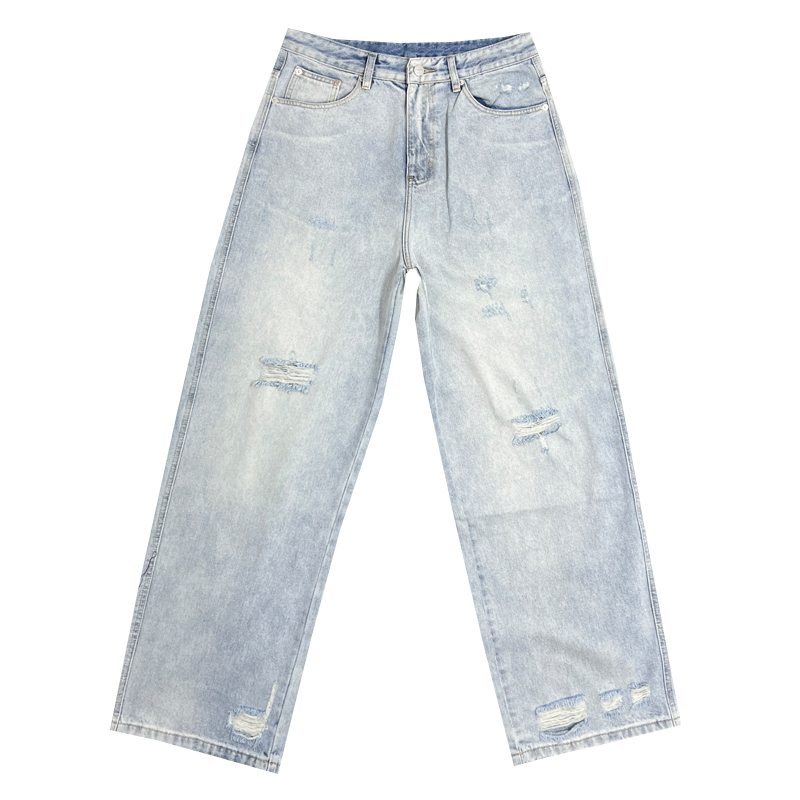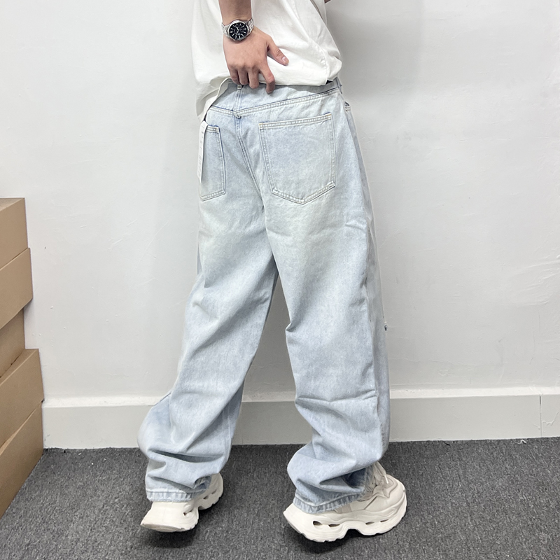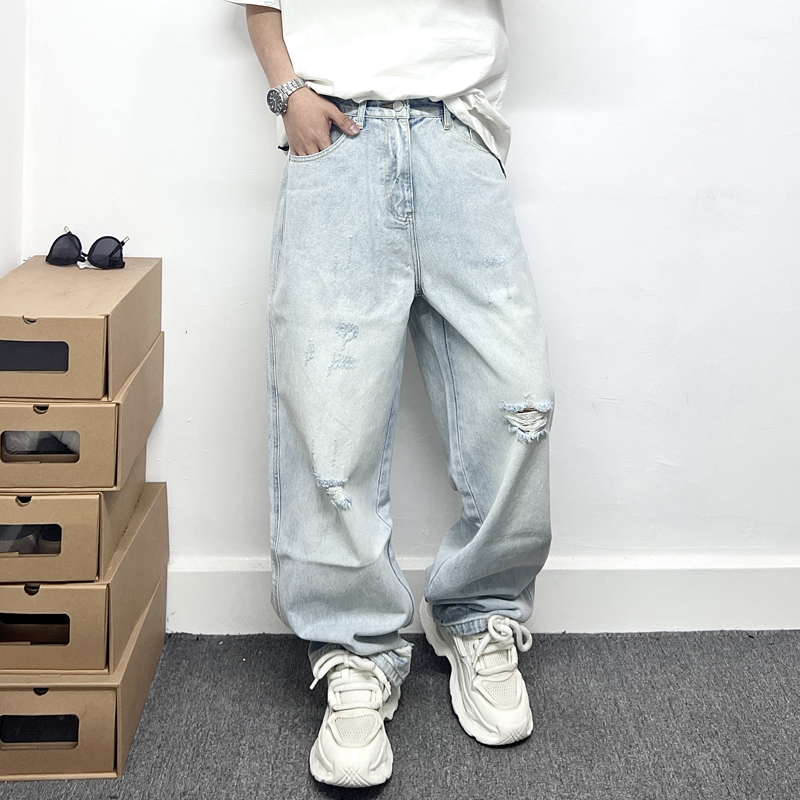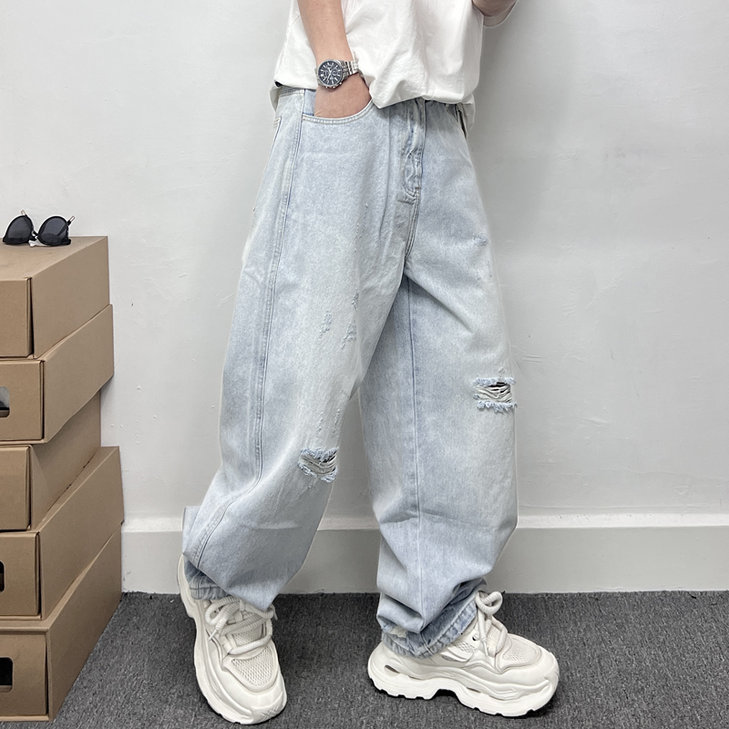 美式休闲浅色破洞牛仔裤男痞帅潮流百搭宽松大码微垮直筒阔腿长裤