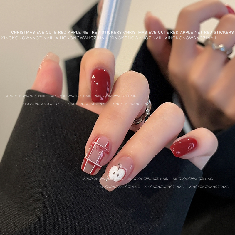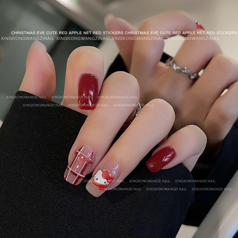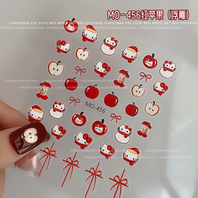 新款可爱红苹果美甲贴纸卡通立体Kitty猫咪红色蝴蝶结DIY指甲贴花