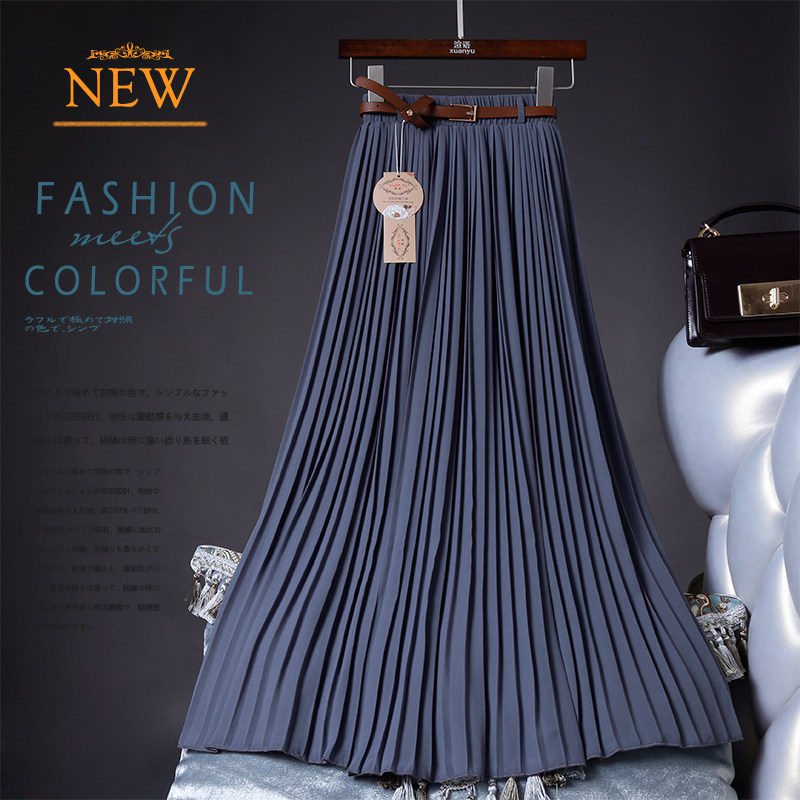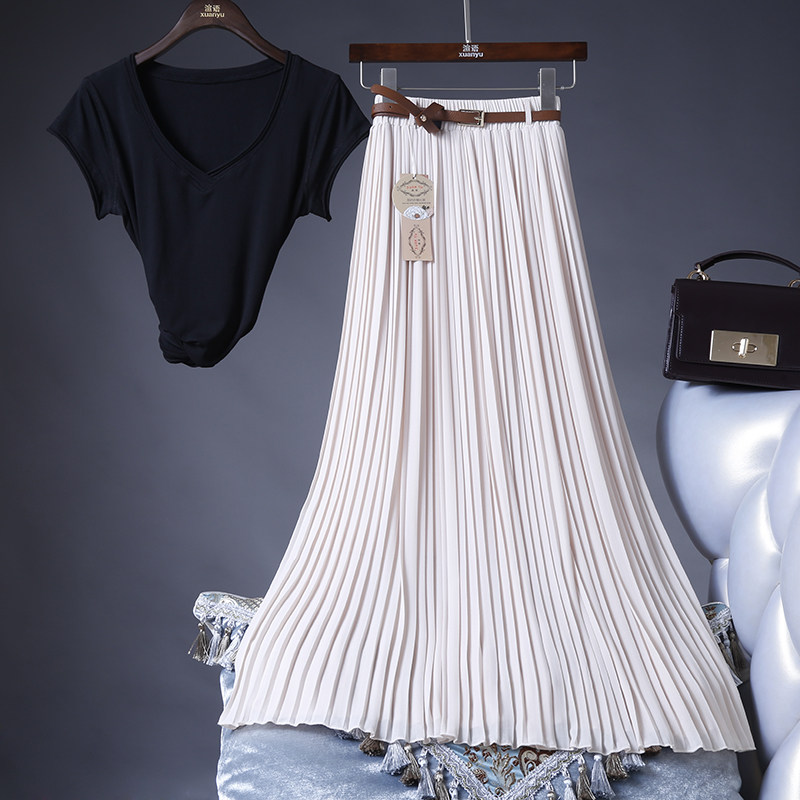 夏季新款百搭高腰雪纺百褶半身裙中长裙飘逸大摆沙滩度假长裙薄款