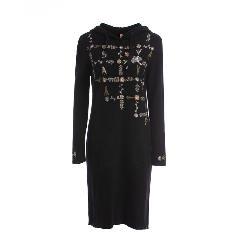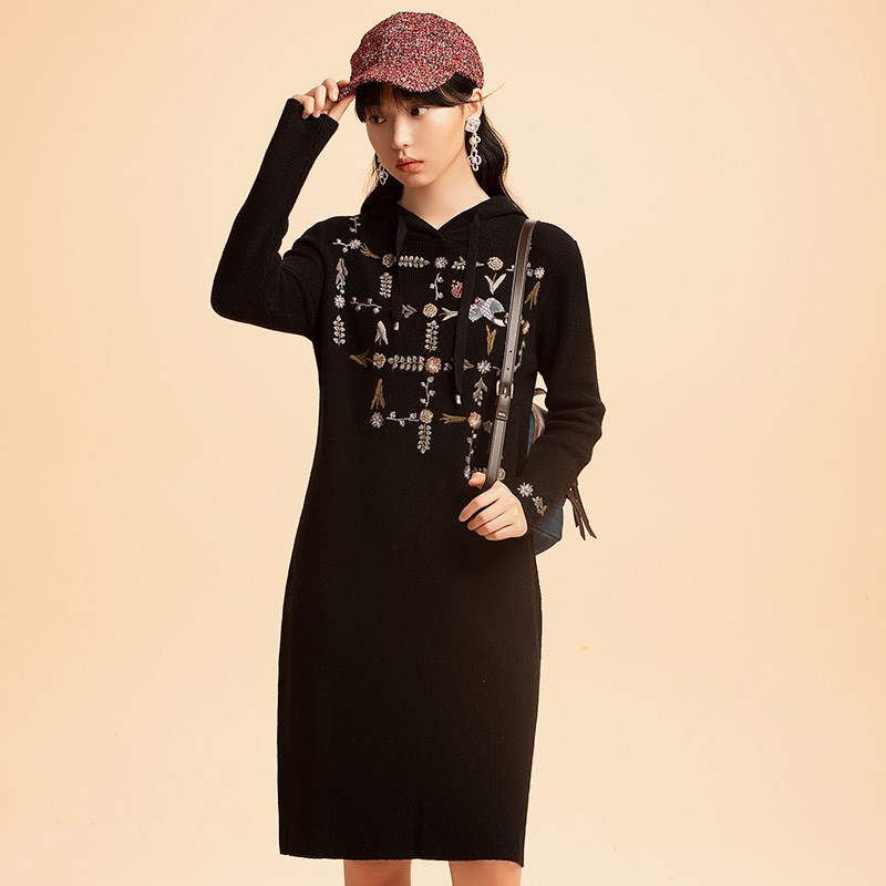渔牌女装新款秋冬装带帽绣花过膝长款羊毛针织连衣裙FGED0306