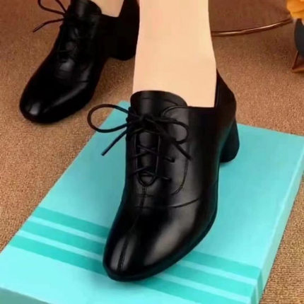 真软皮单鞋女夏季新款粗跟中低跟女鞋方头系带黑色皮鞋子舞蹈