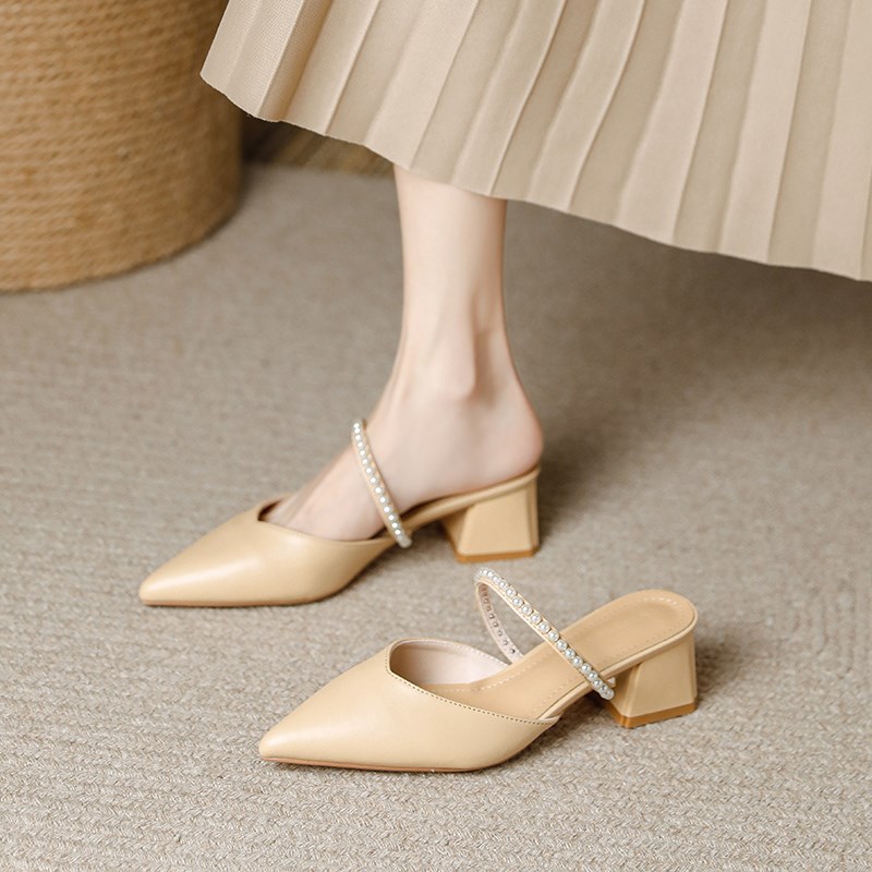 法式裸色粗跟尖头一字带包头高跟凉鞋女懒人拖鞋一脚蹬春夏新款