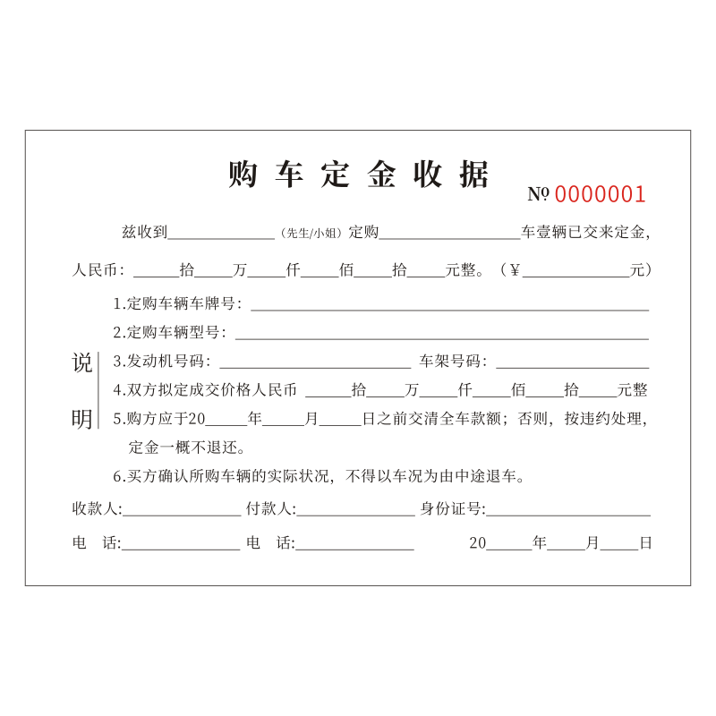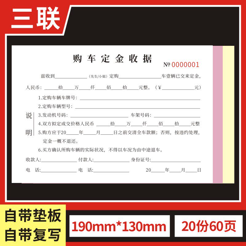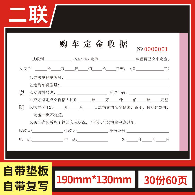 购车定金收据定制订做通用版买车卖车意向书车辆买卖汽车销售单二手车订金单据旧车汽车销售结算清单收车订金