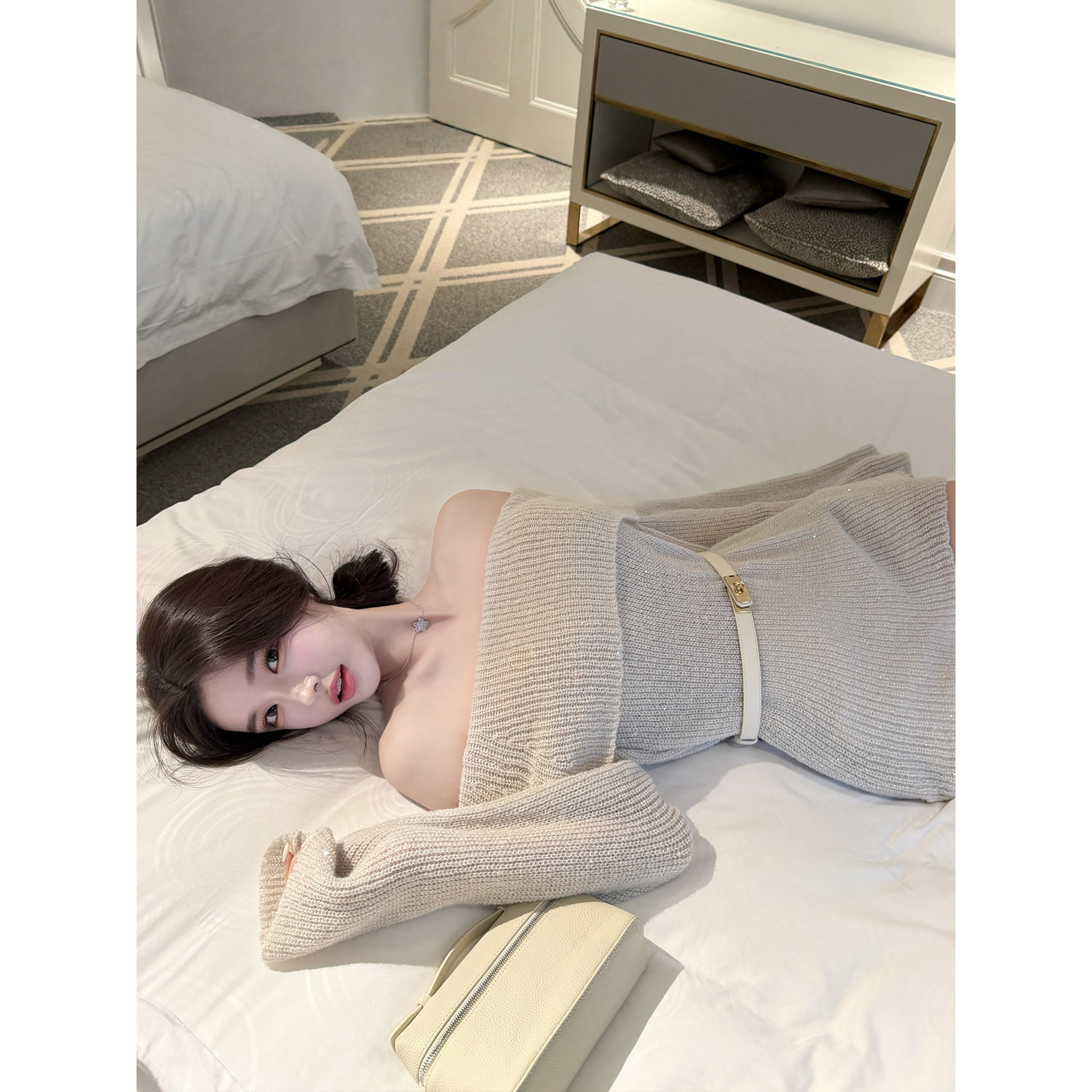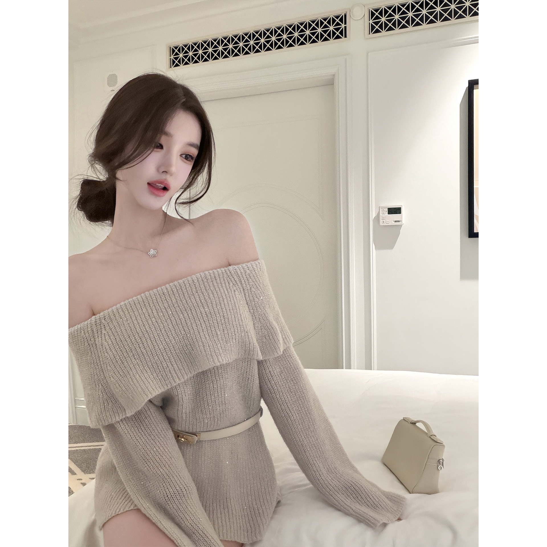 【若语1/22 20:00新品9.5折】巴黎日落 10羊毛细闪一字肩连衣裙