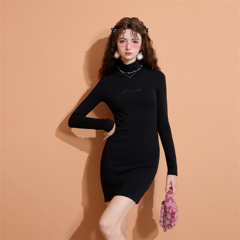 艾美斯汤迪千金风春秋修身包臀针织毛衣连衣裙女高领打底裙