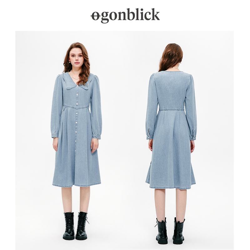北欧时刻2025春季新款娃娃领牛仔连衣裙女收腰a字中长裙复古气质