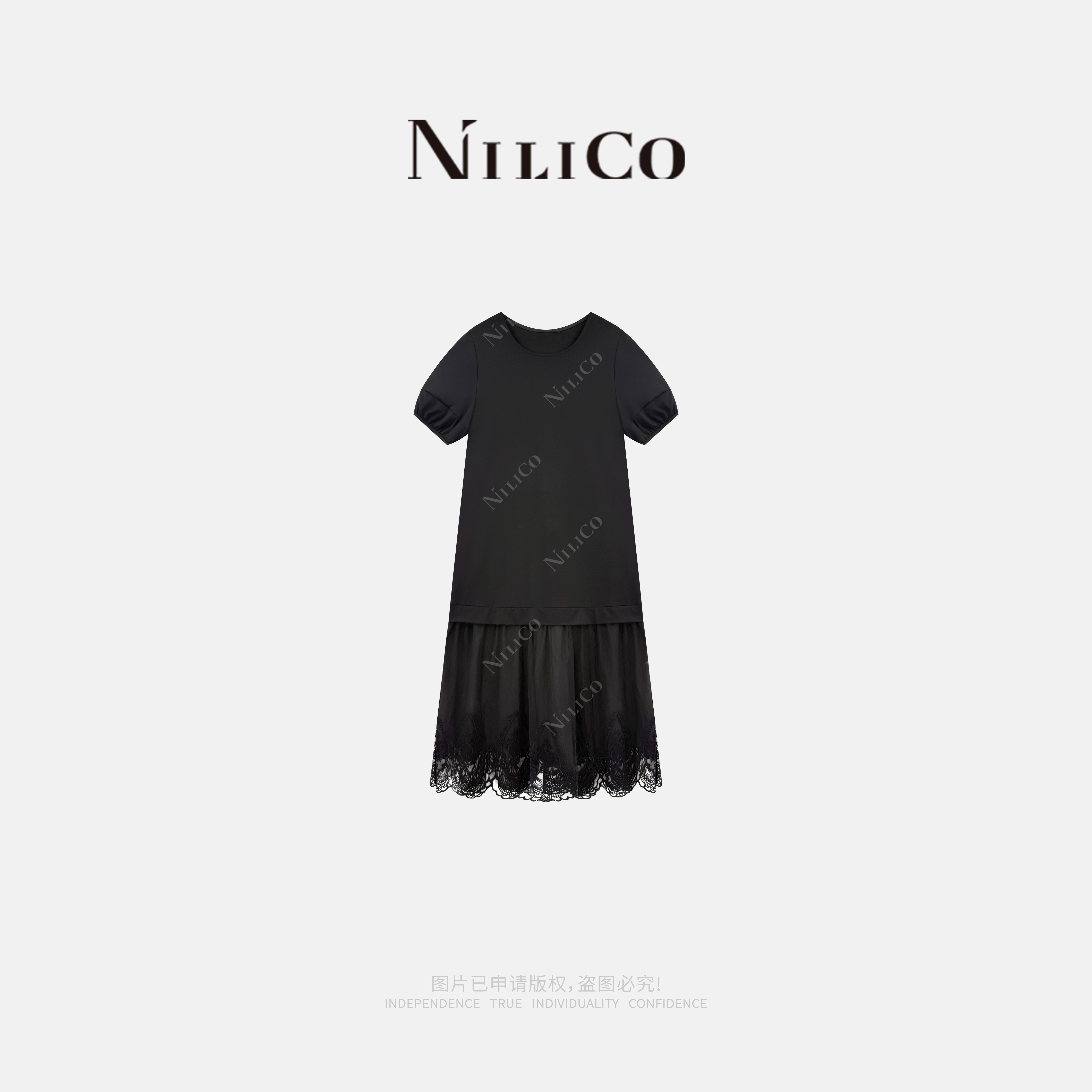 NILICO陈媚【黑夜蕾丝】黑色优雅拼接蕾丝连衣裙