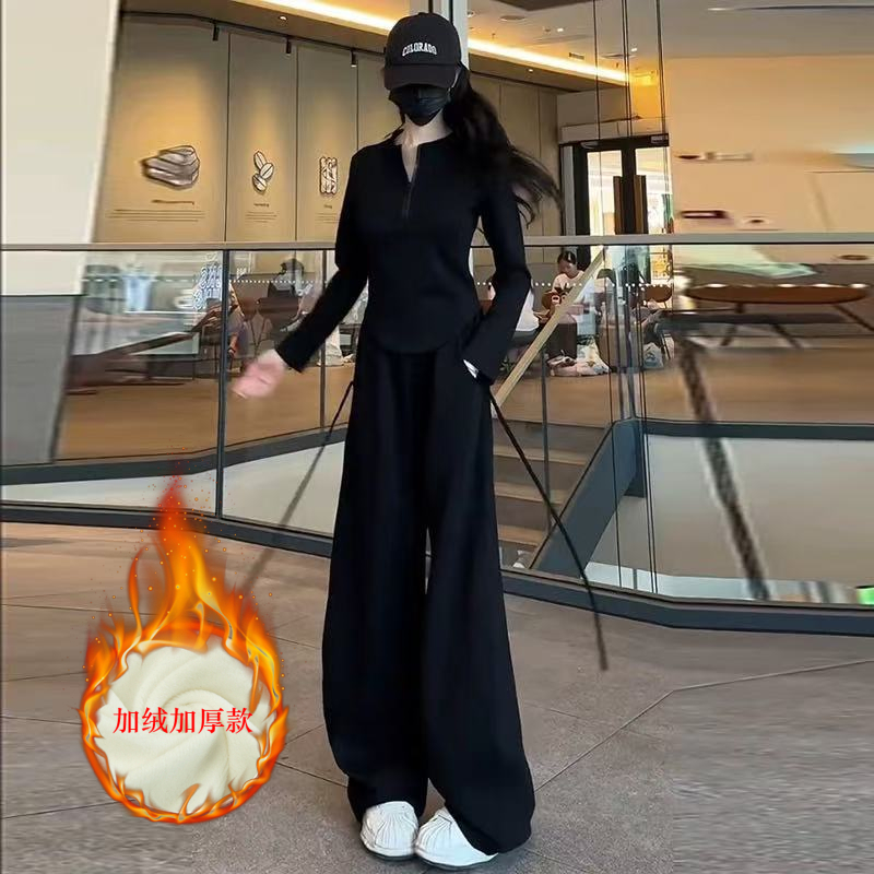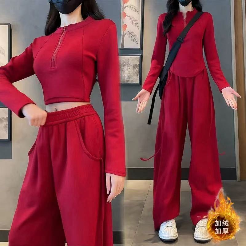 红色时尚休闲套装女秋冬2025新款气质半拉链卫衣阔腿裤显瘦两件套