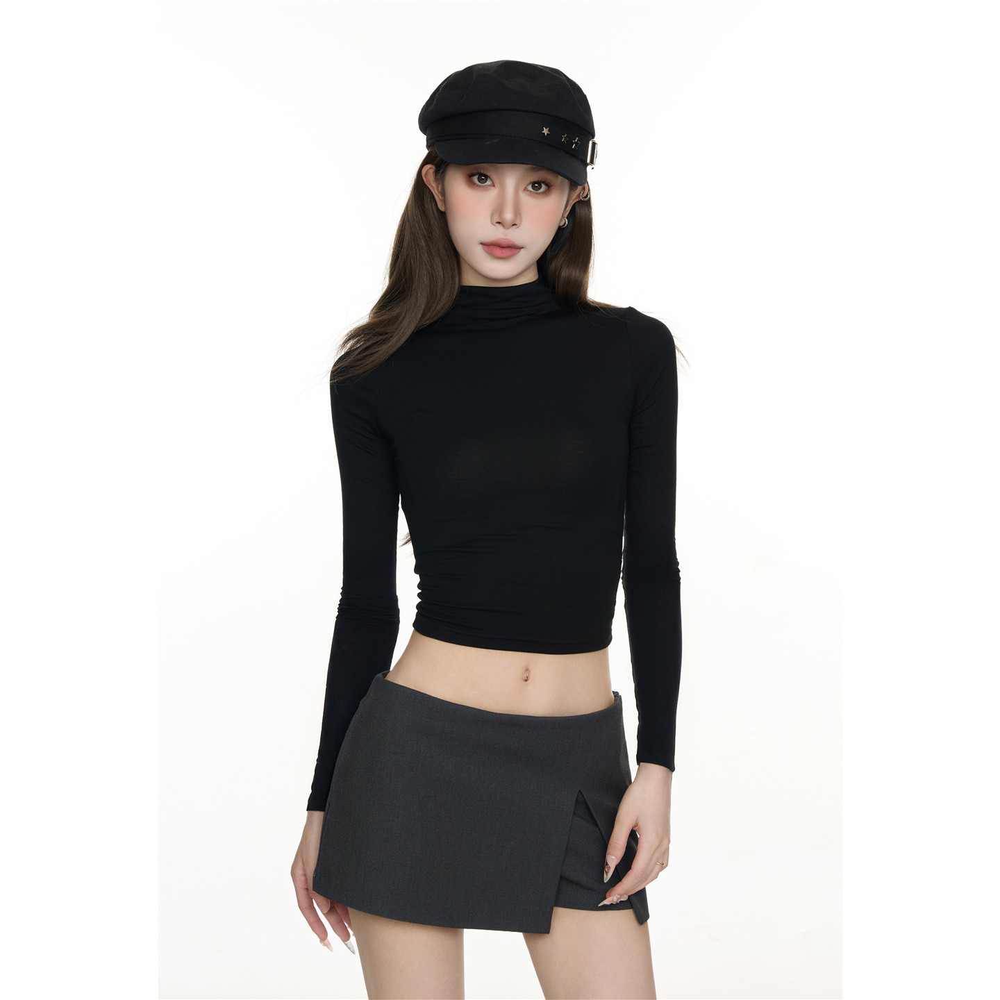 黑色长袖t恤女小高领打底衫内搭2025秋新款修身显瘦短款漏脐上衣