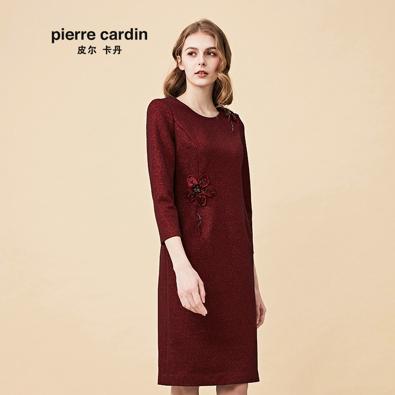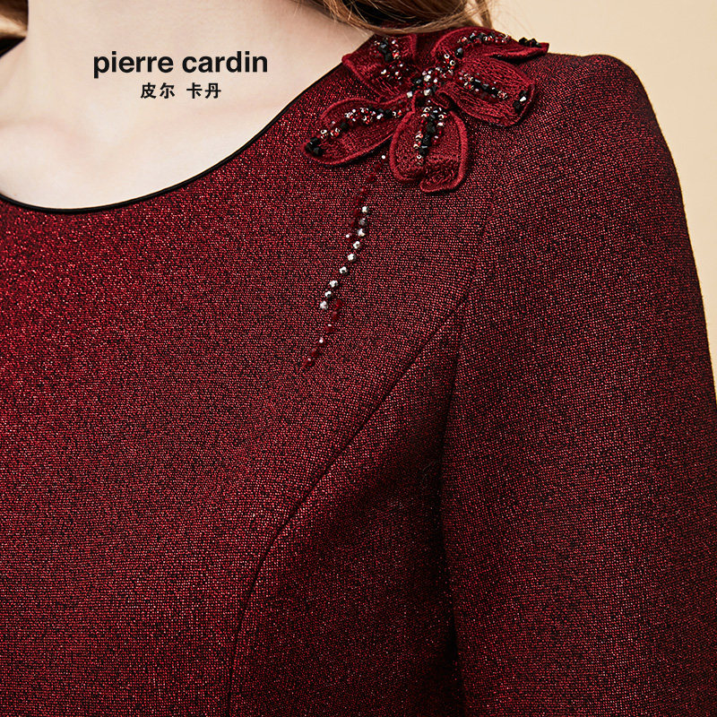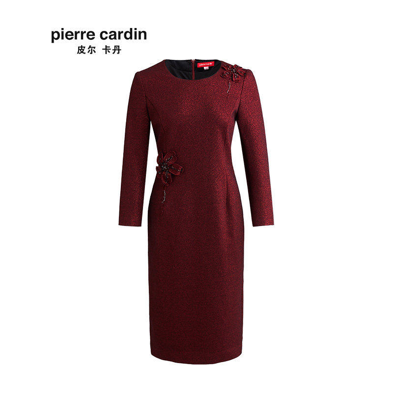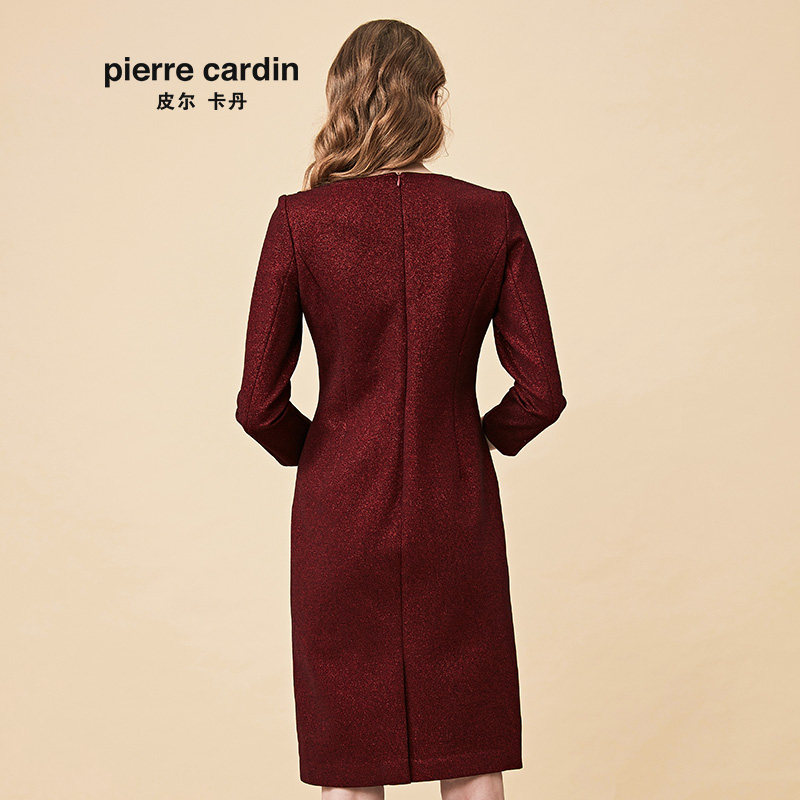 【皮尔卡丹女装】秋季新品酒红色长袖小众连衣裙端庄高贵一步裙