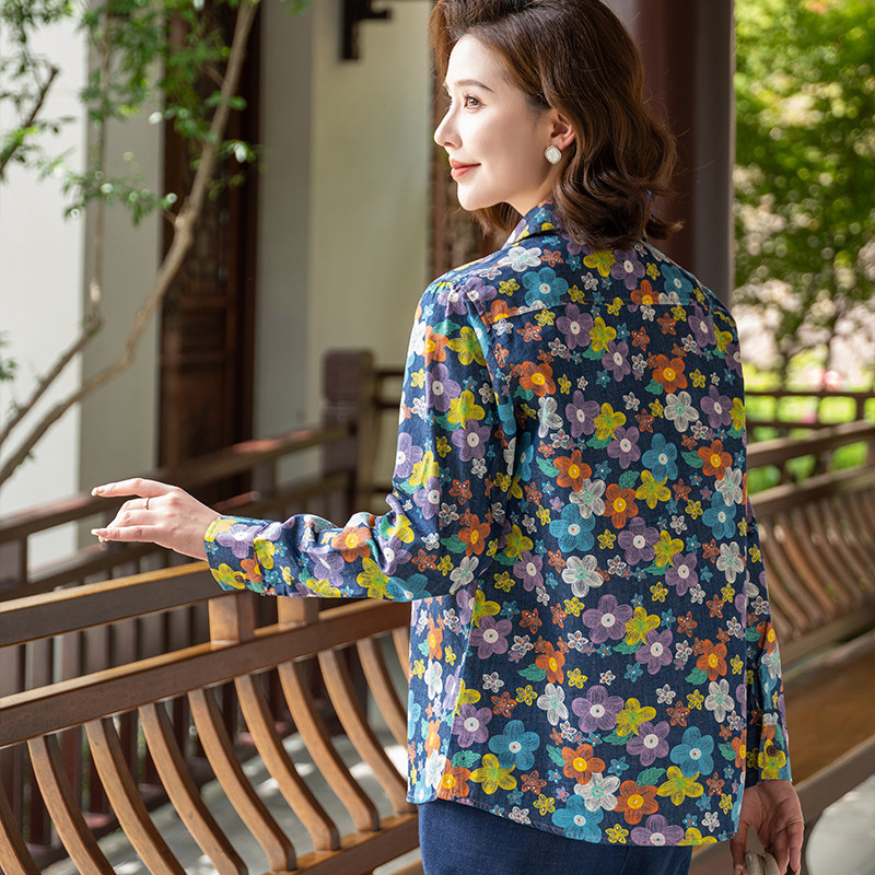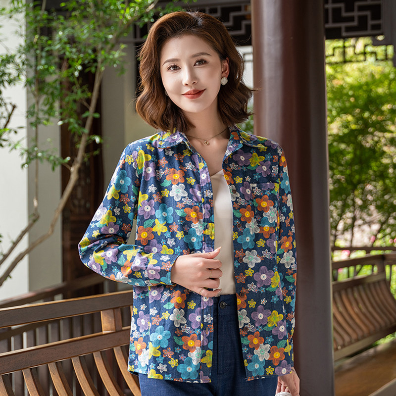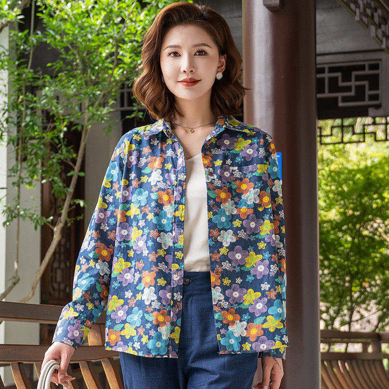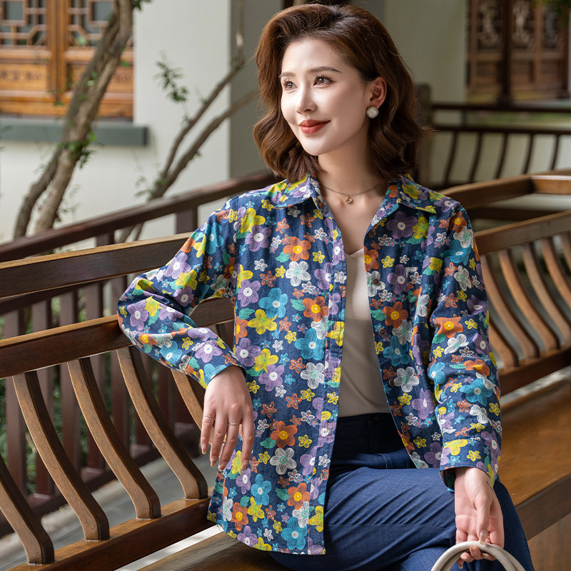 富木春夏新款碎花长袖衬衫纯棉牛仔布洋气花色上衣女装SW1C2412R4