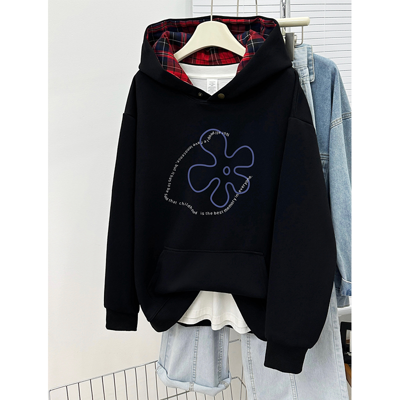 美式复古格子纽扣连帽卫衣女秋冬季加绒加厚设计感大码帽衫外套潮