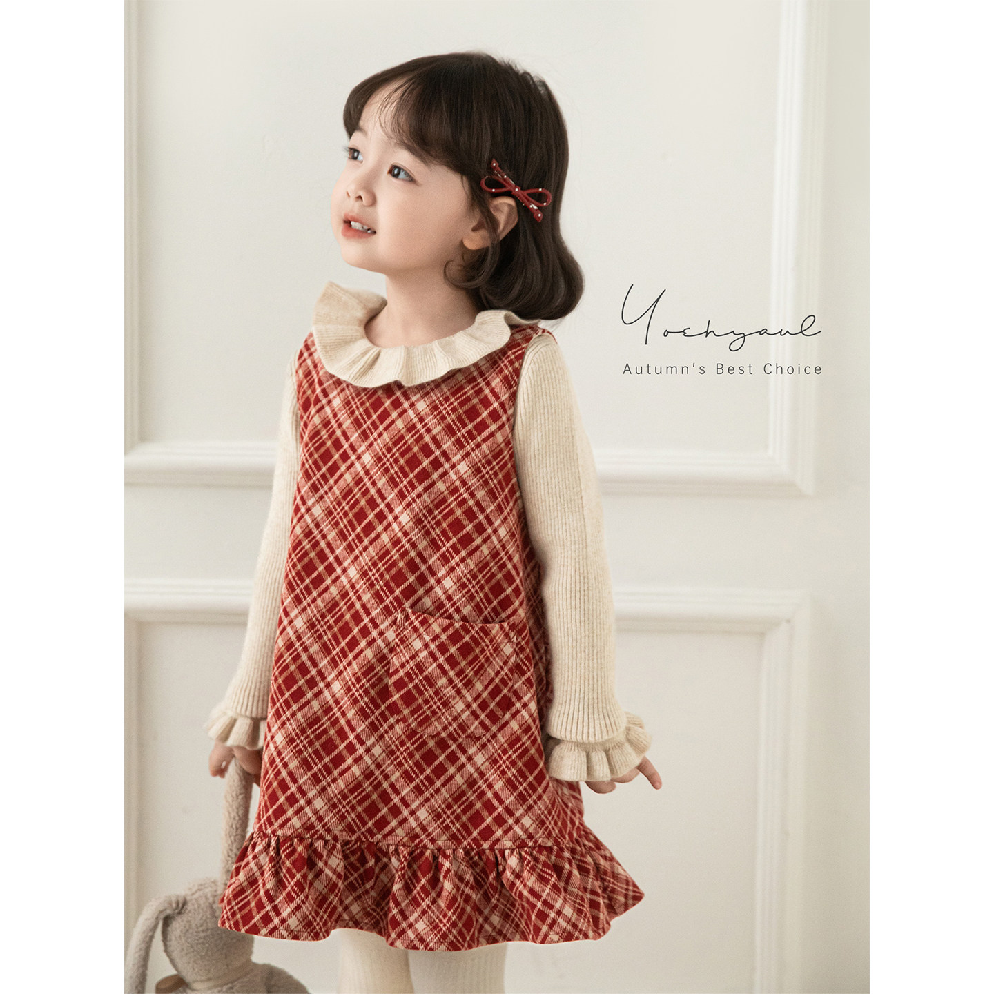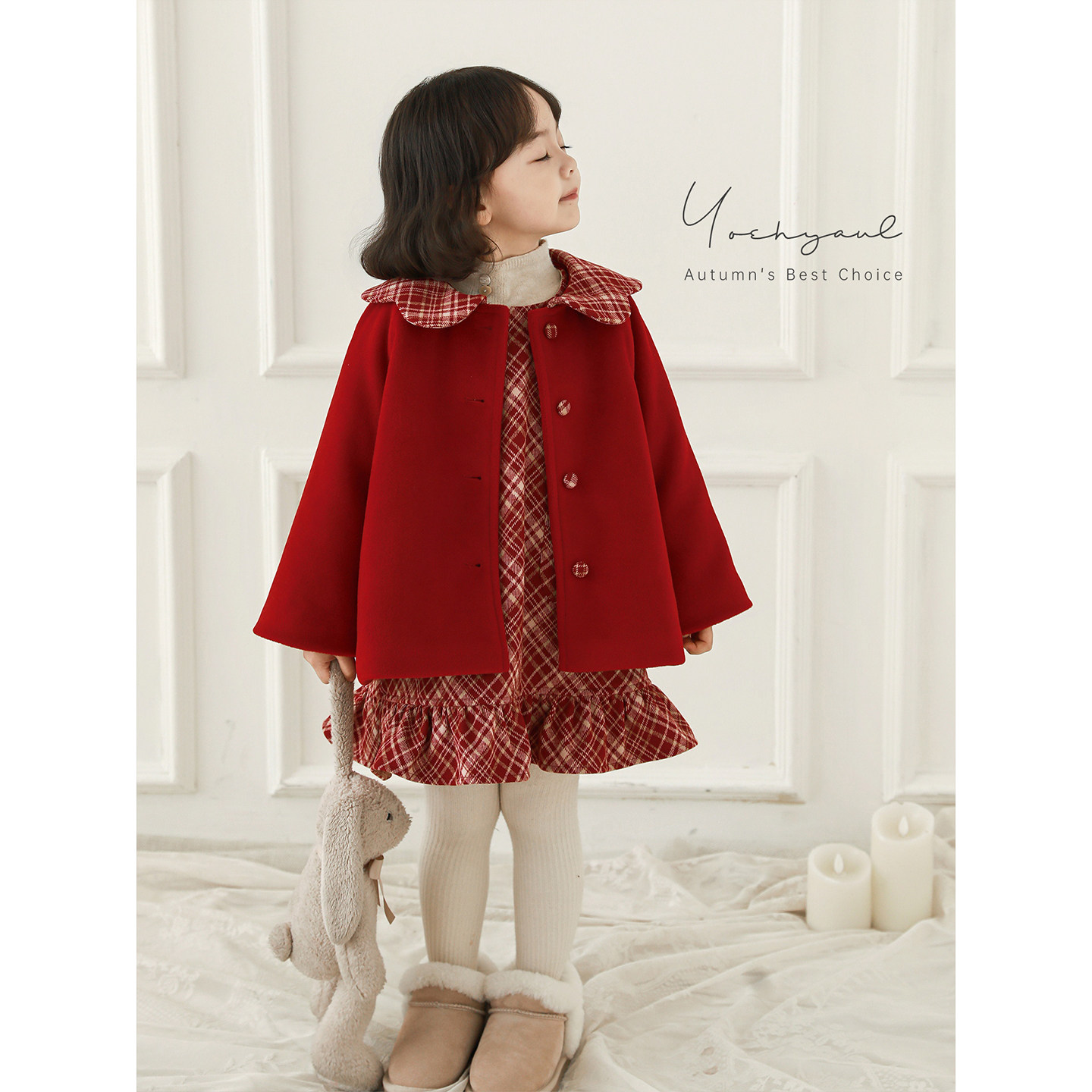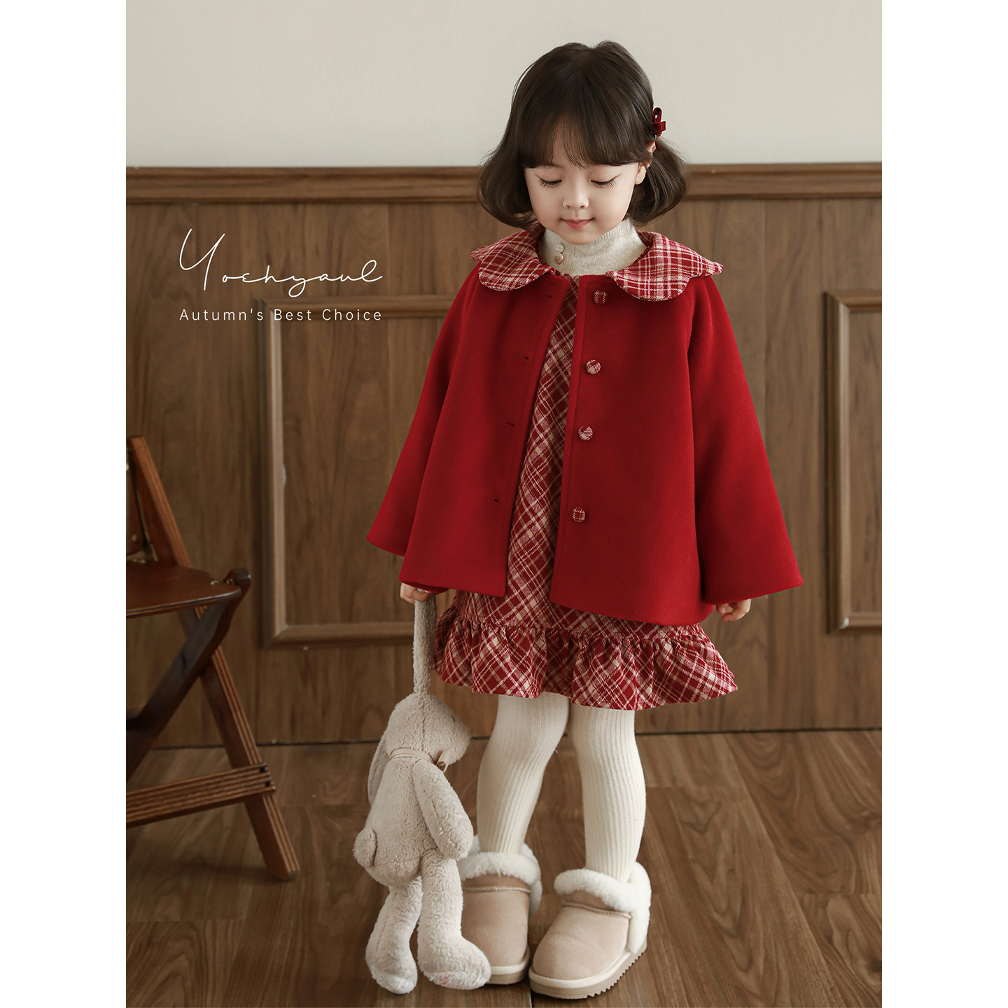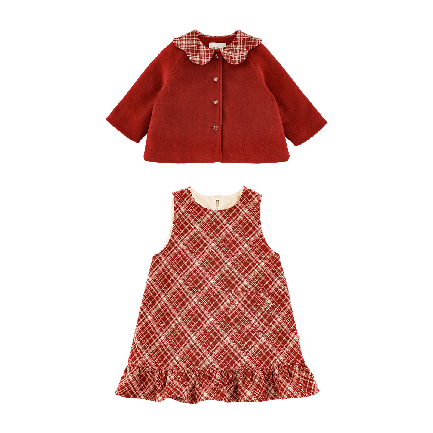 幼悠女童2025冬季新款娃娃领加绒保暖外套红色格子背心裙套装年服
