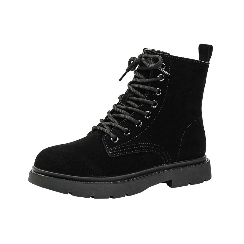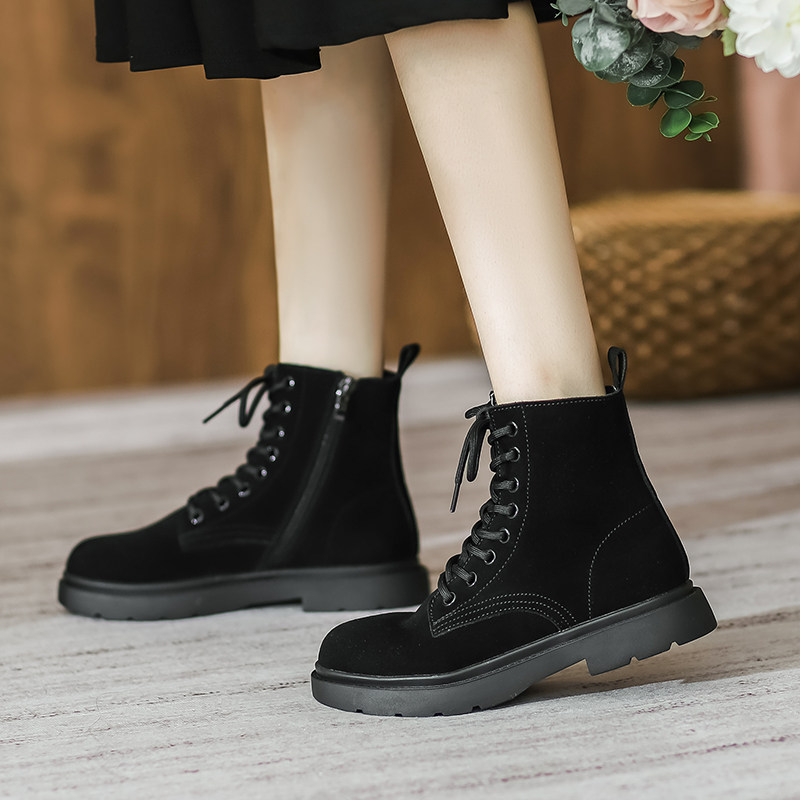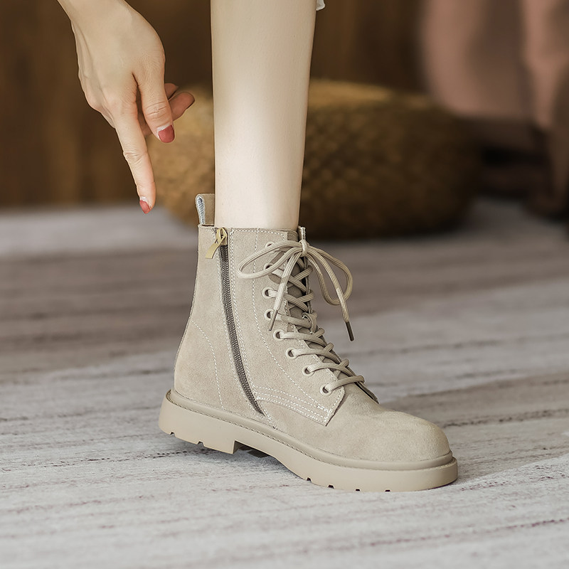 真皮加绒马丁靴女2025秋冬季新款单靴英伦风圆头平底系带磨砂短靴