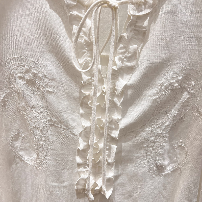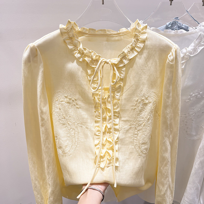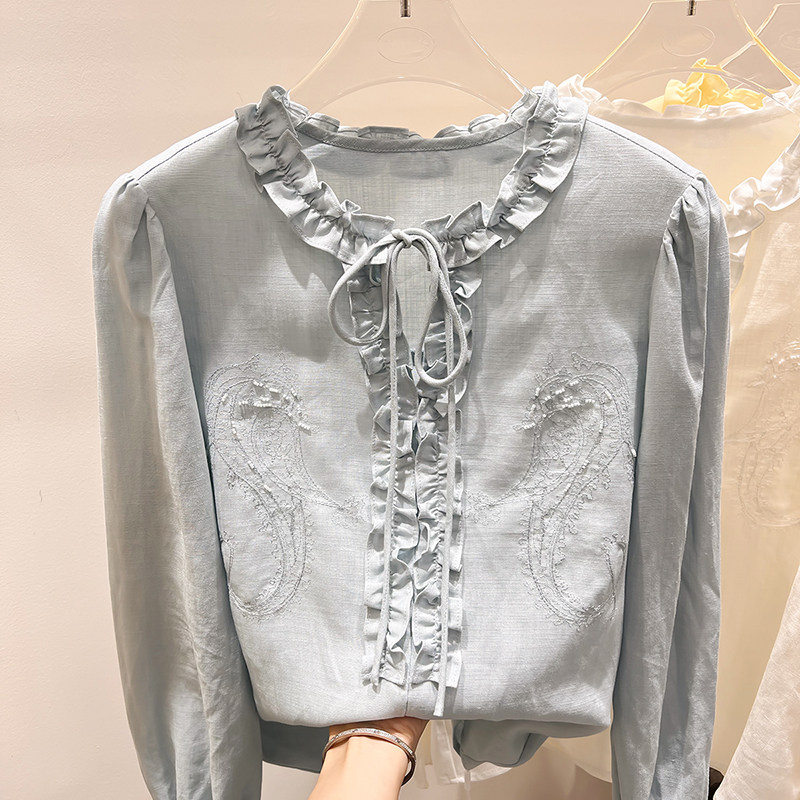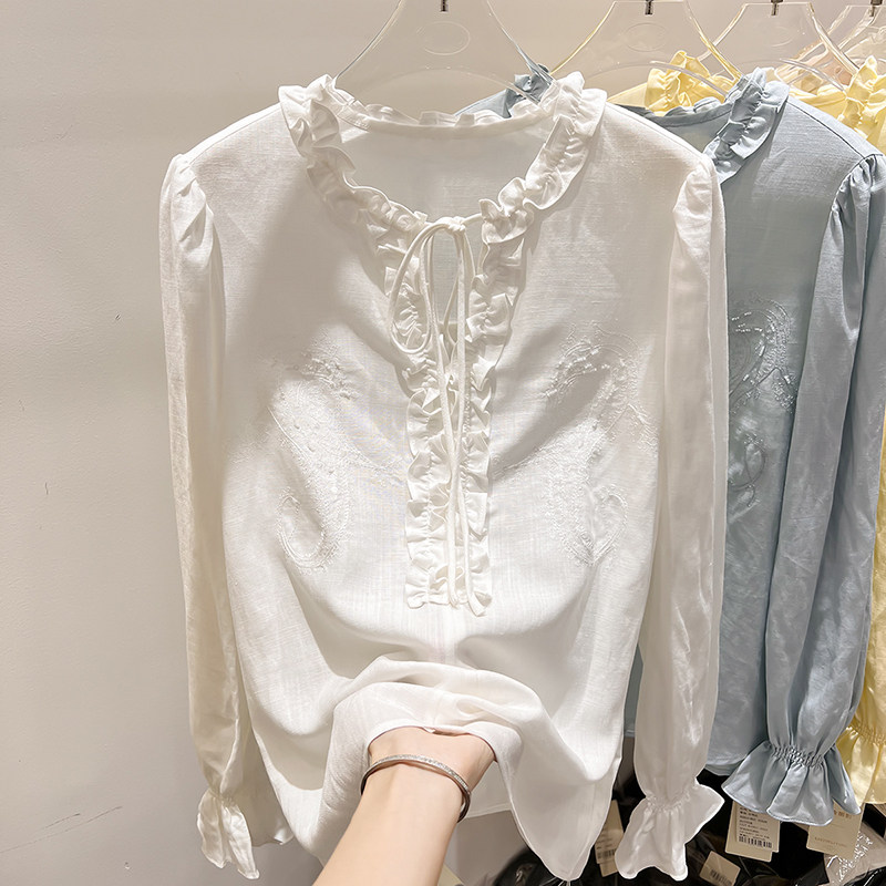 2026新款法式气质显瘦圆领木耳边系带刺绣串珠长袖衬衫上衣女春季