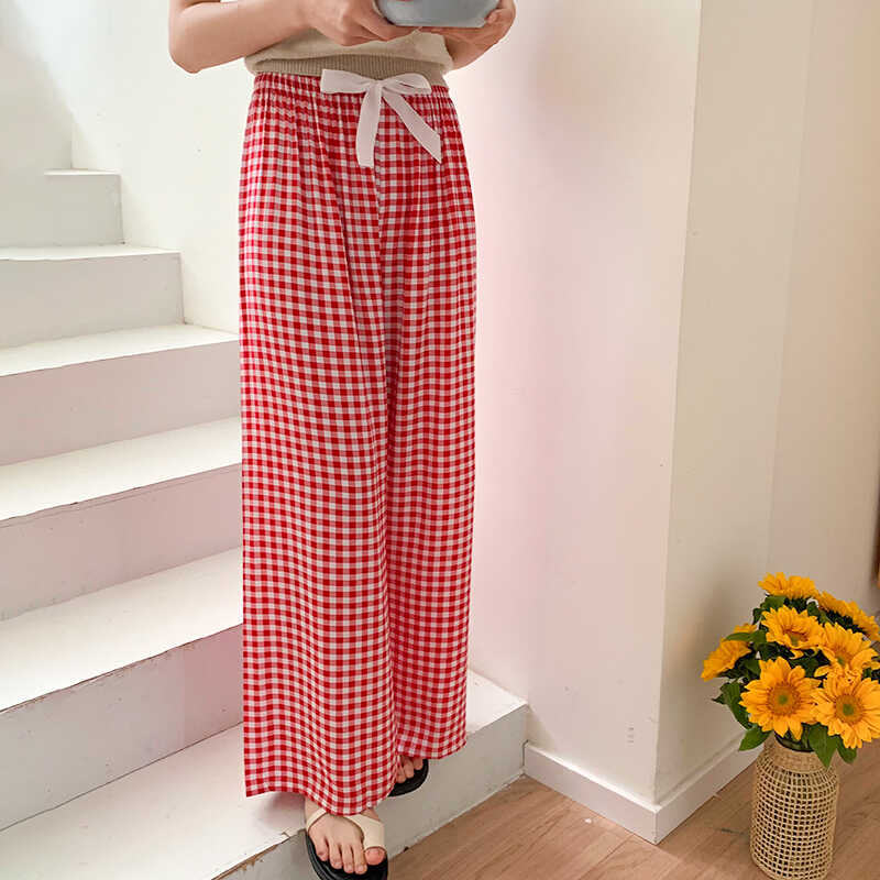棉绸睡裤夏薄款大红格子女人造棉慵懒格纹外穿直筒休闲宽松阔腿裤