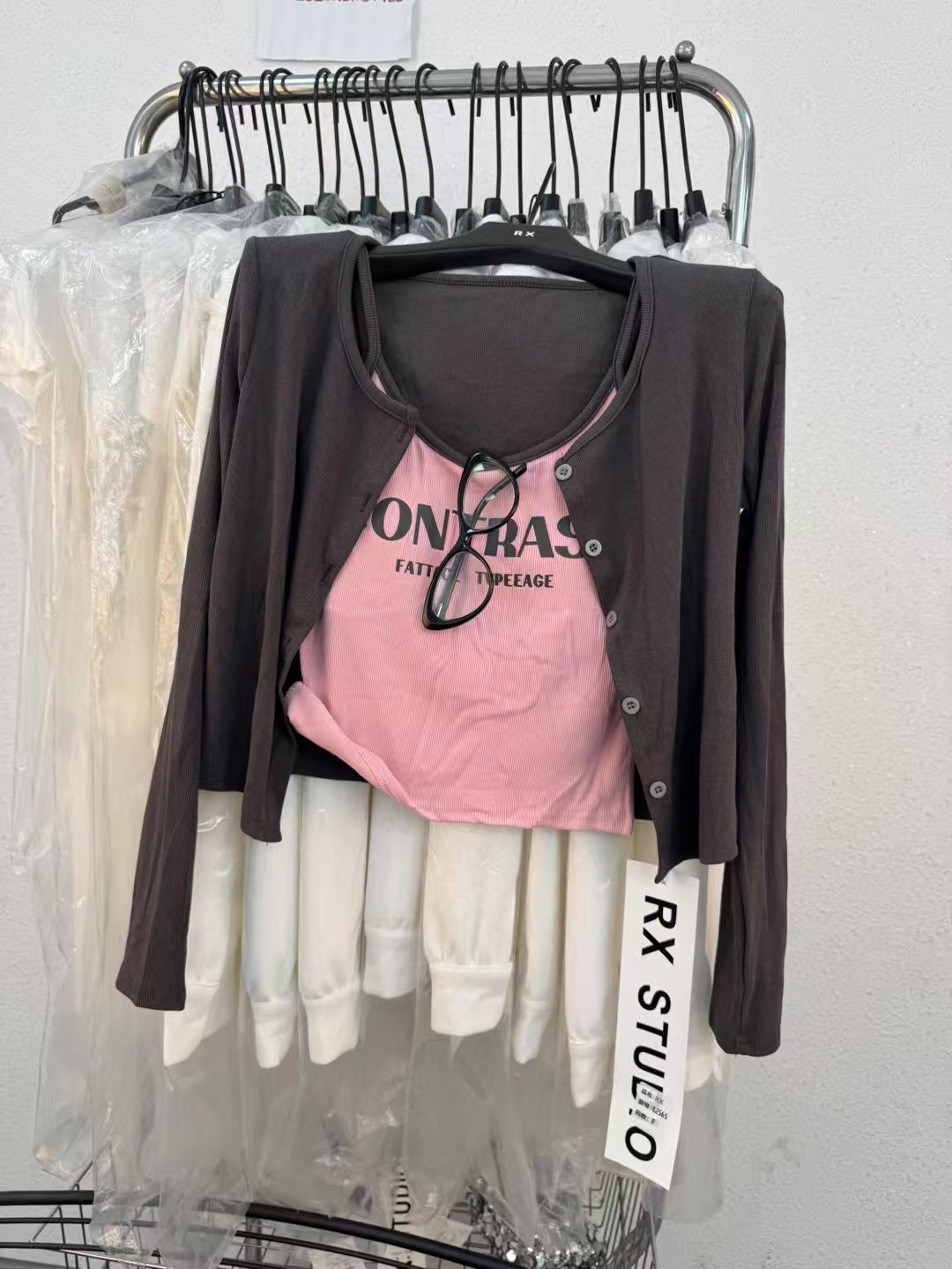 2025秋季新款韩版字母印花带胸垫背心配短款修身开衫长袖两件套女