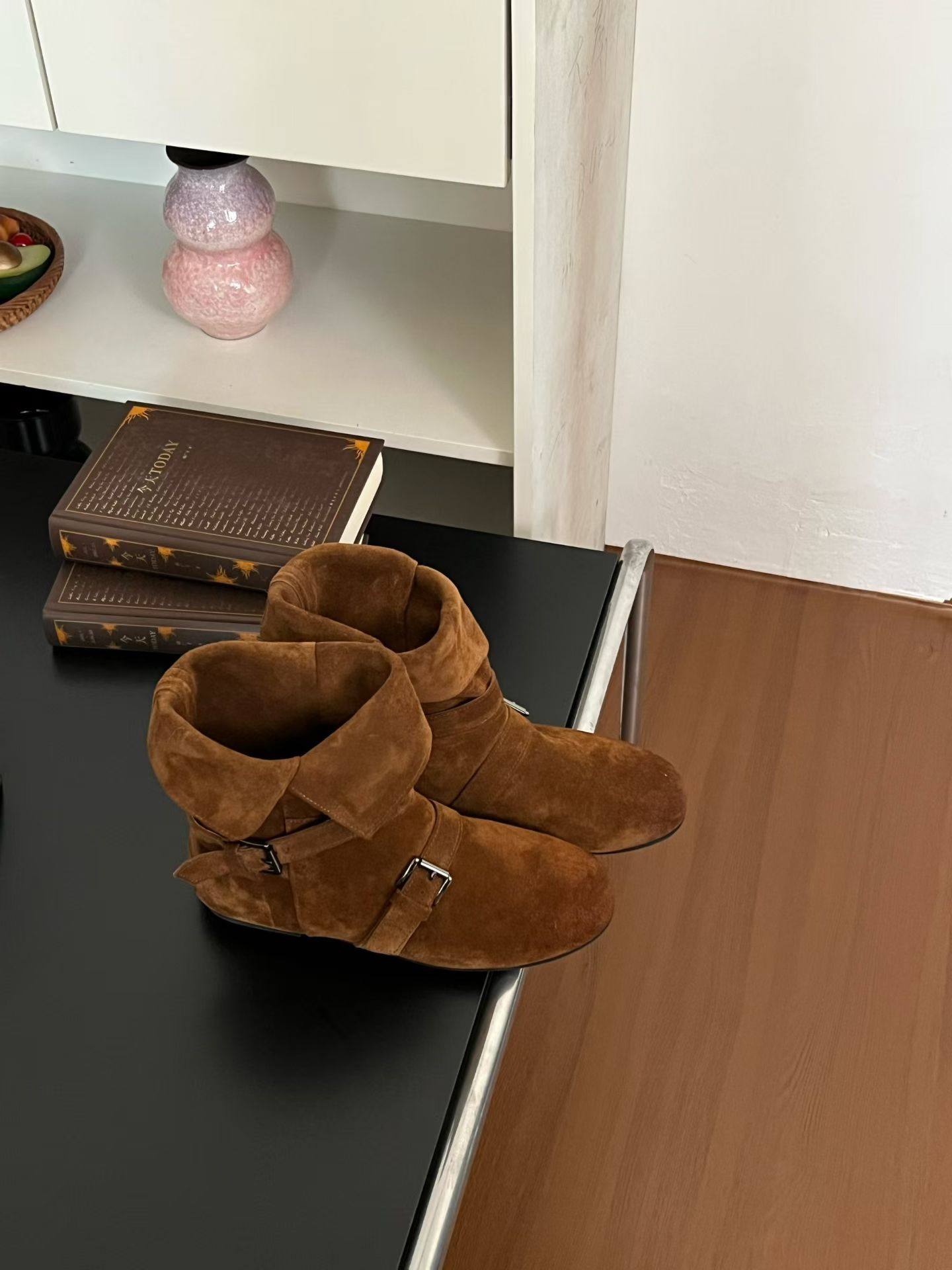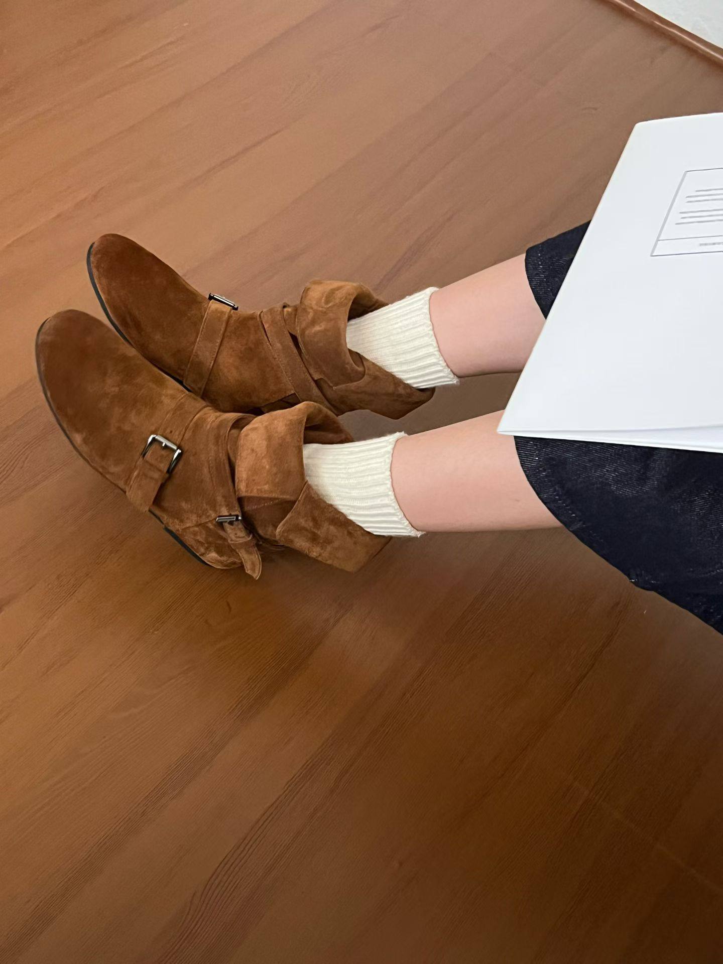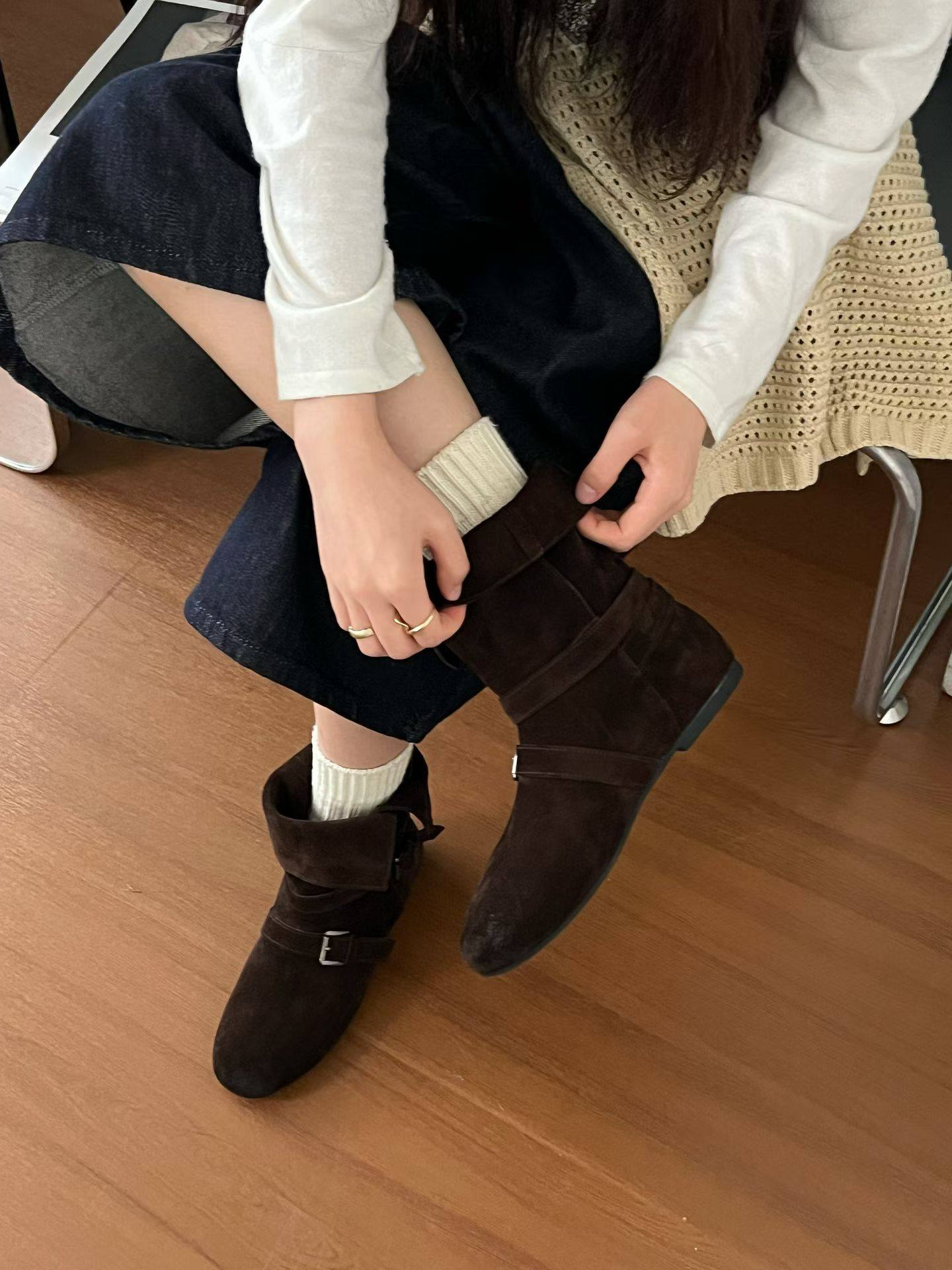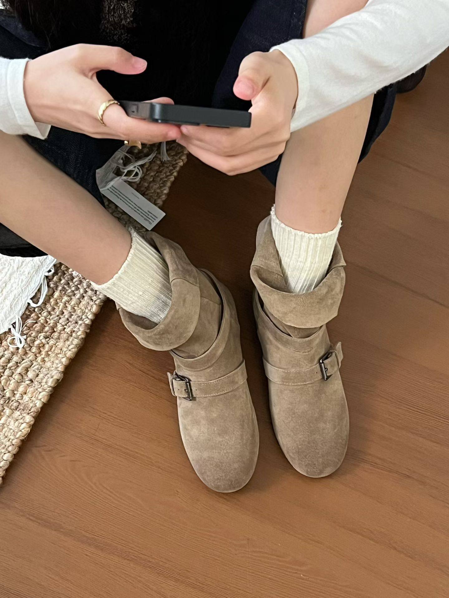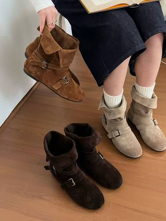 gelly真皮法式复古平底短靴女两穿可翻折棕色时装靴英伦风皮带扣