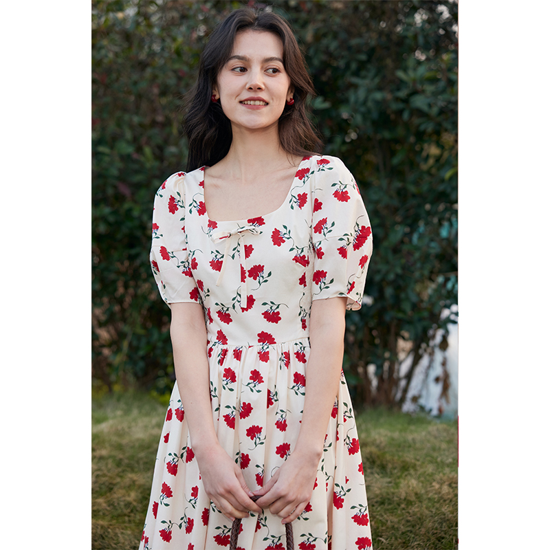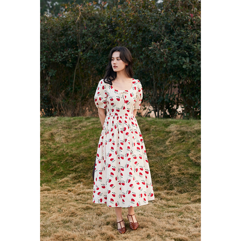 HeyDress原创扶桑花印花连衣裙女夏季法式方领收腰显瘦A摆长裙子