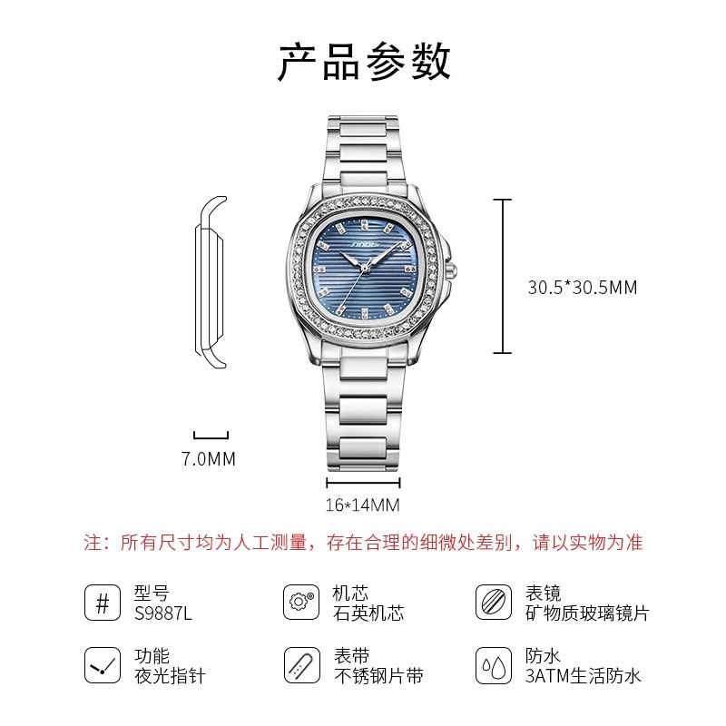 Sinobi女士手表女款高颜值鹦鹉螺防水方表复古夜光钢带跨境手表女