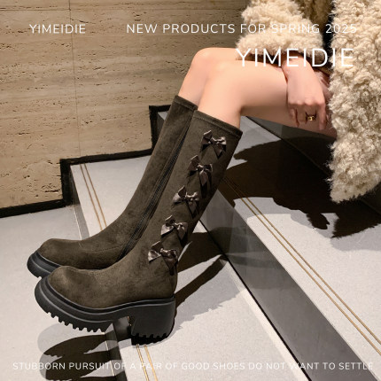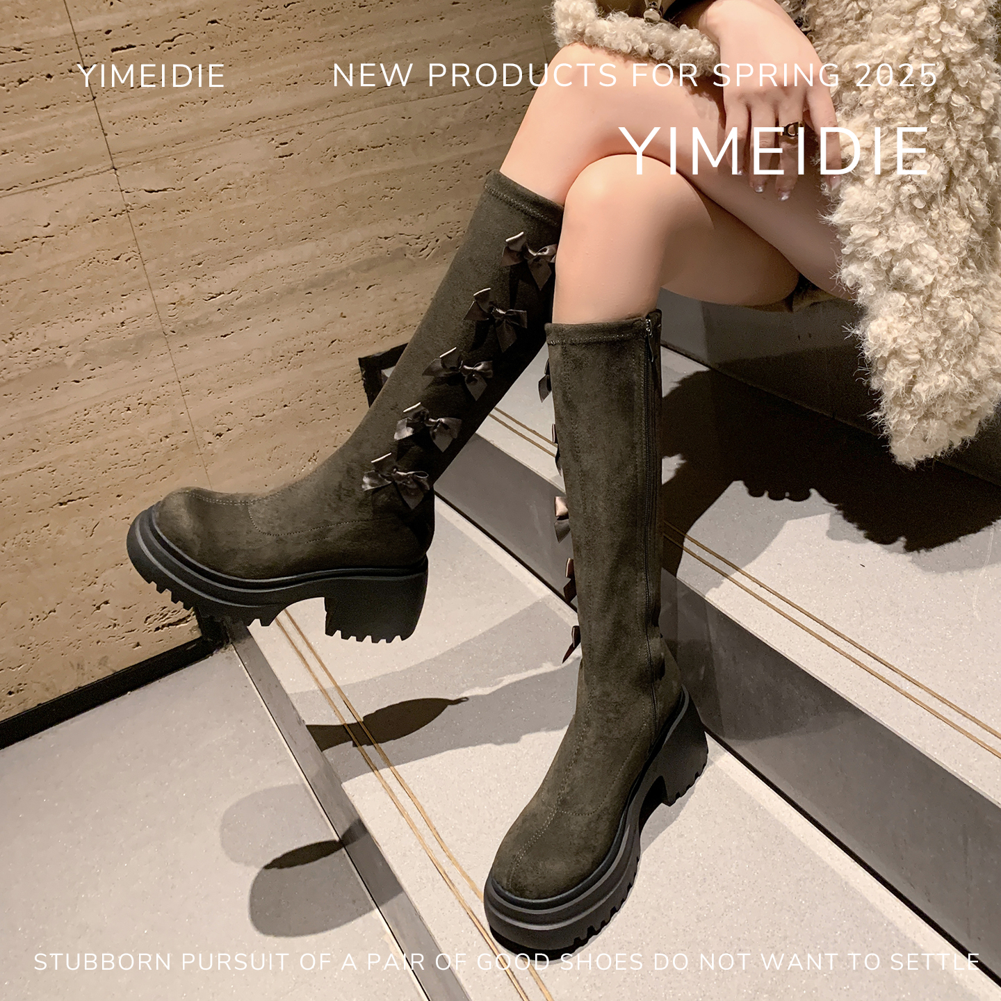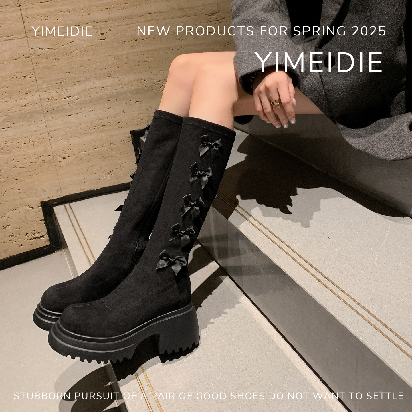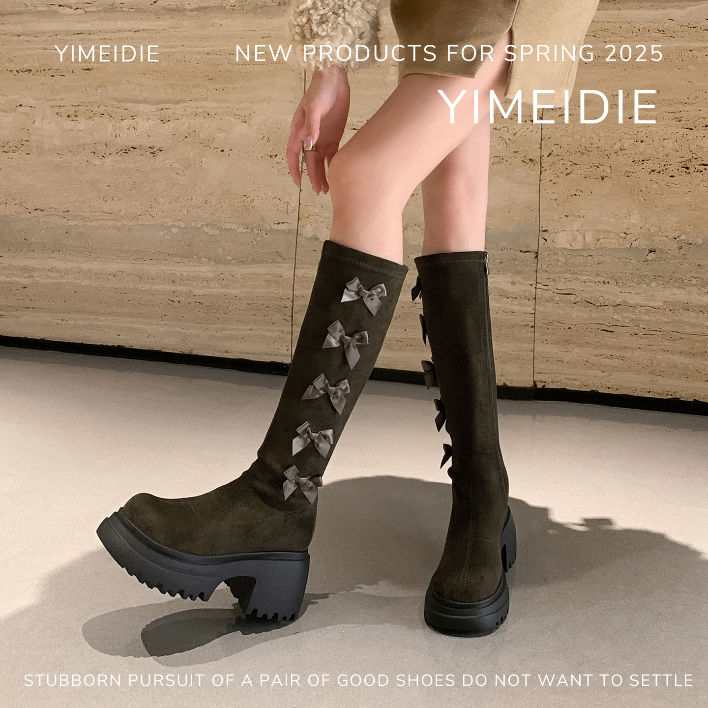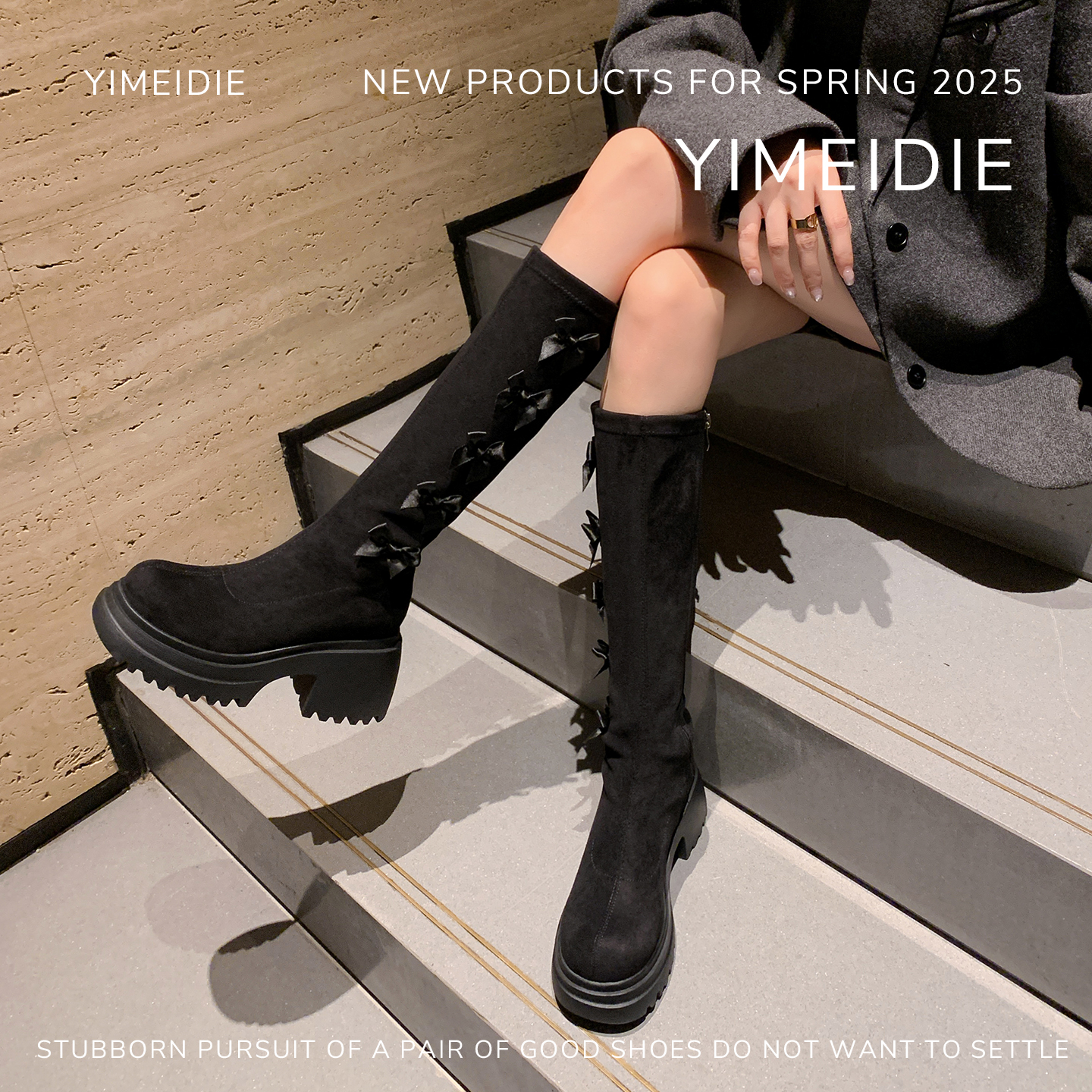 厚底粗跟弹力靴女高筒靴2025秋冬新款小个子舒适不过膝高跟瘦瘦靴