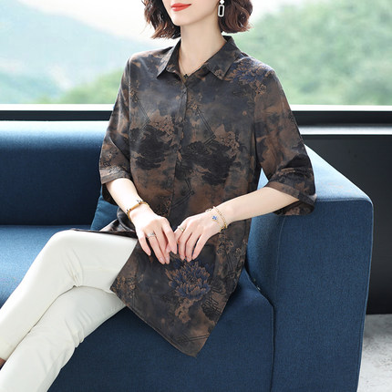 重磅真丝中长款衬衫中袖印花香云纱中老年女装洋气妈妈桑蚕丝上衣