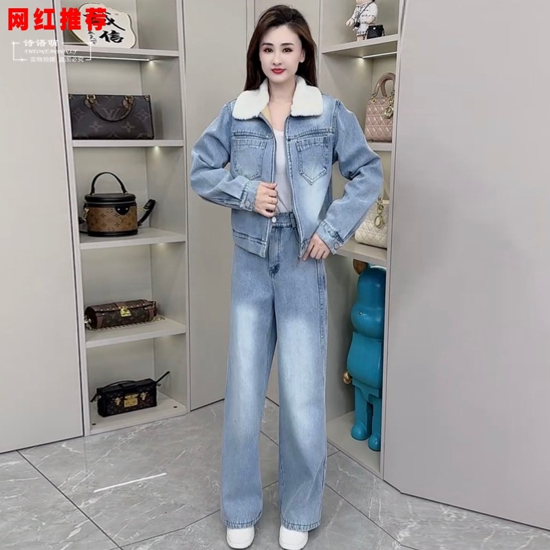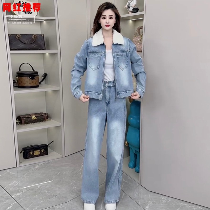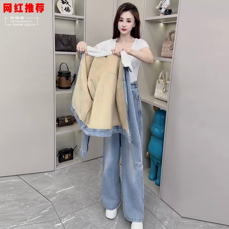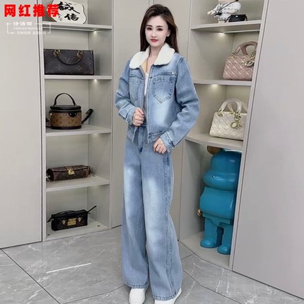 2025新款时尚显瘦牛仔套装女冬季加绒加厚休闲外套阔腿裤两件套装