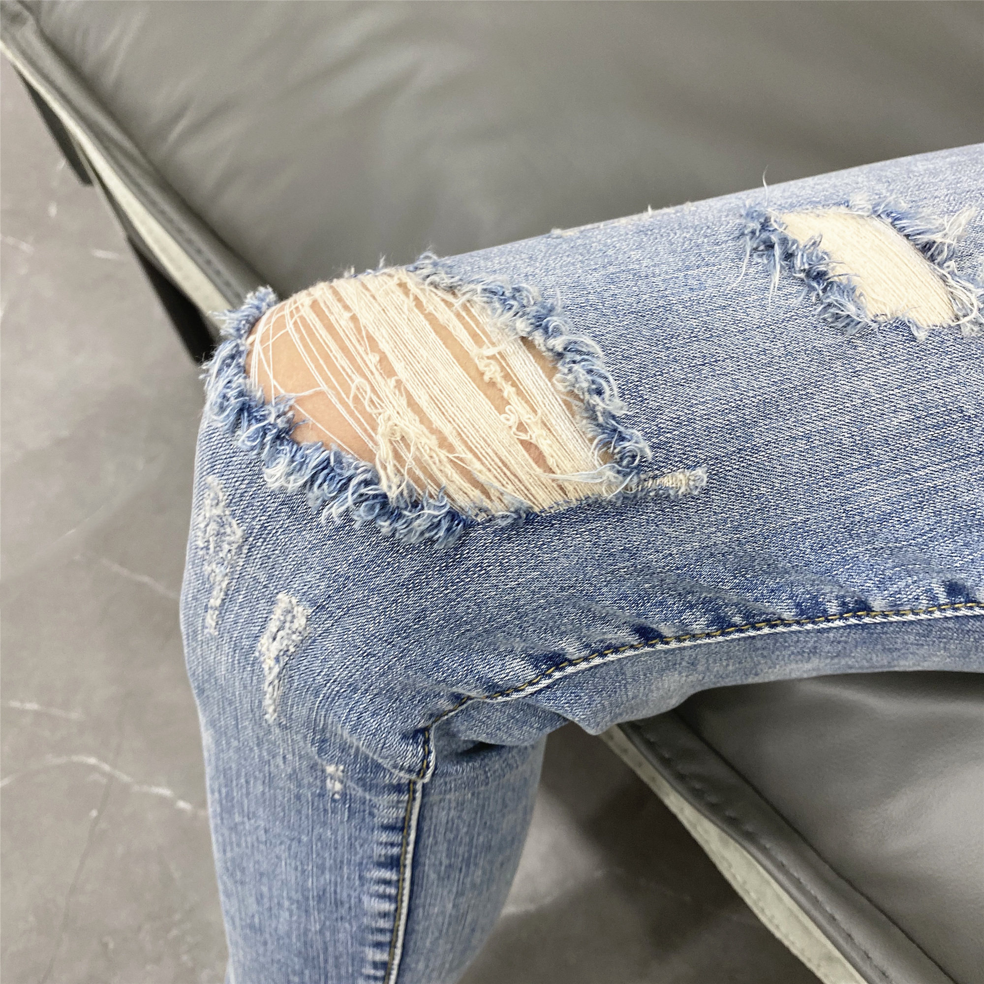 个性破洞浅蓝猫须抓痕修身牛仔裤