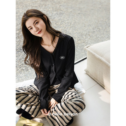 贝妍莫代尔棉睡衣女春秋性感V领气质显瘦长袖条纹长裤家居服套装