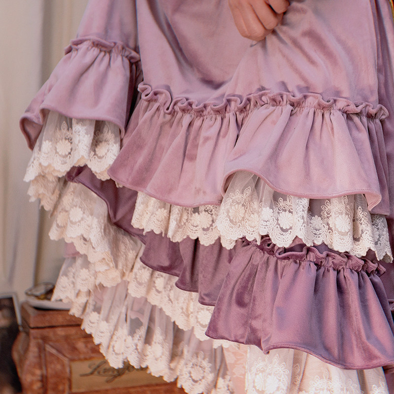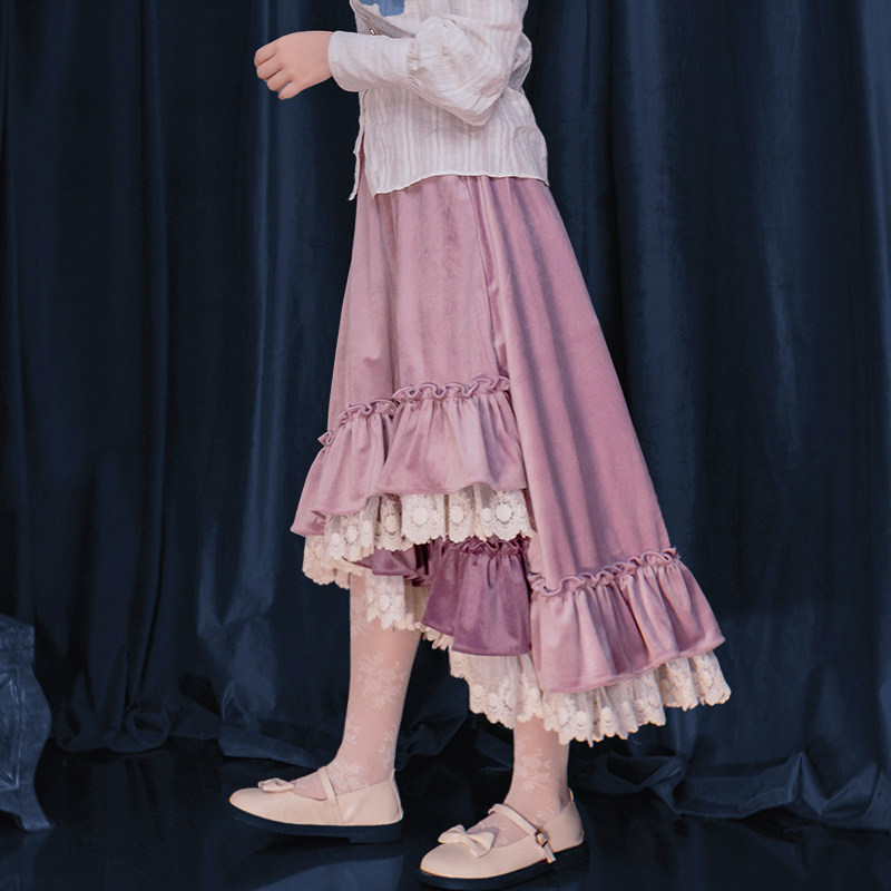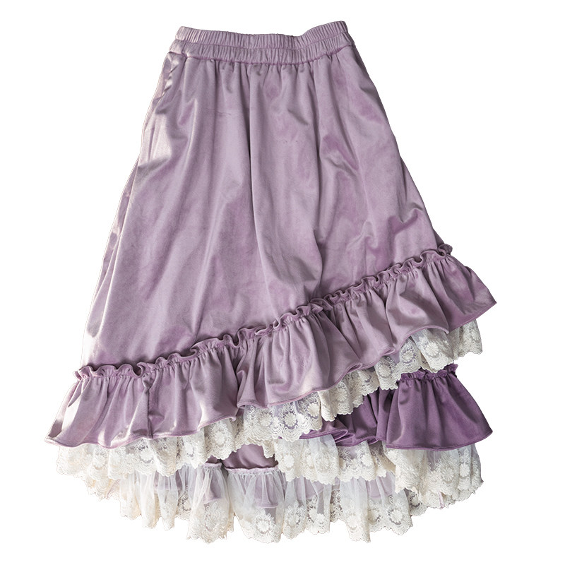 PINKWINK小星夜 秋 紫色原创蕾丝花边不规则大摆高腰加厚半身裙
