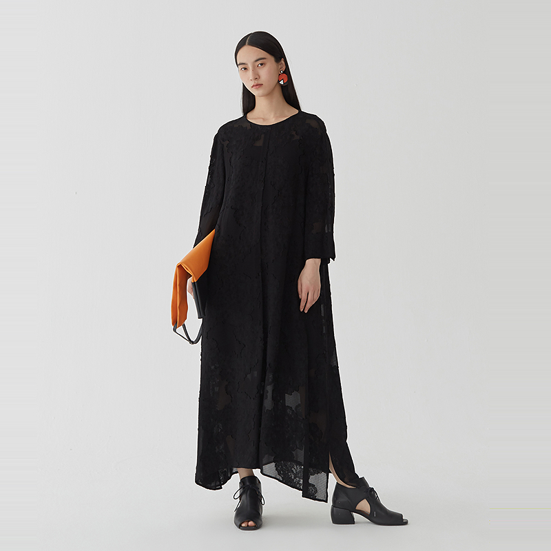 AUM噢姆秋季气质时尚优雅宽松长袖黑色提花裙子圆领中长款连衣裙