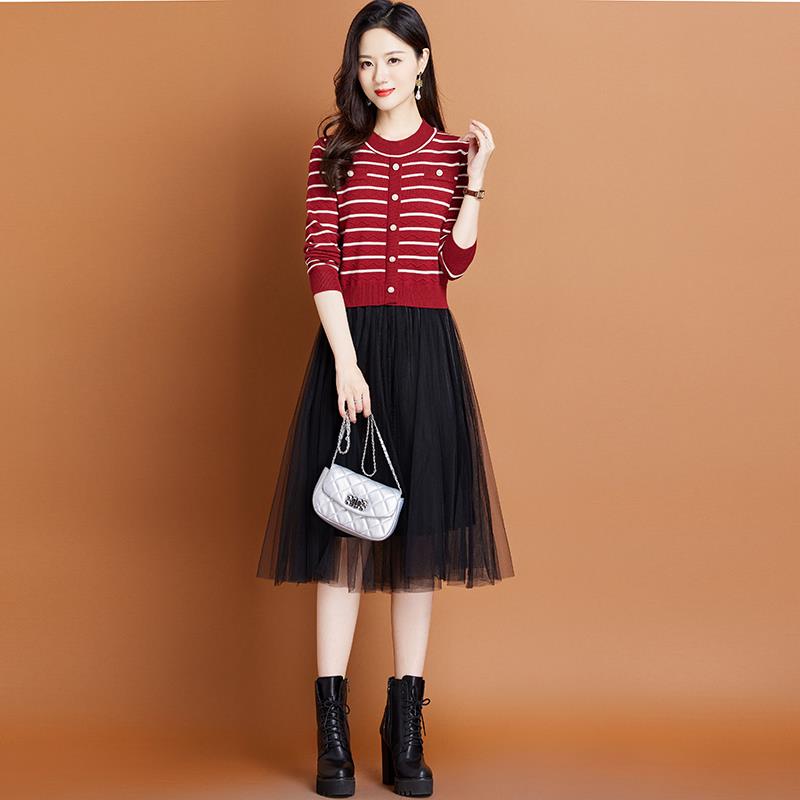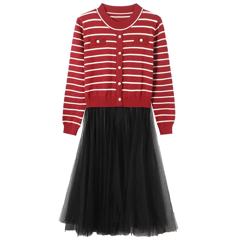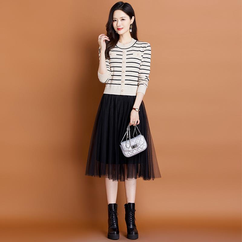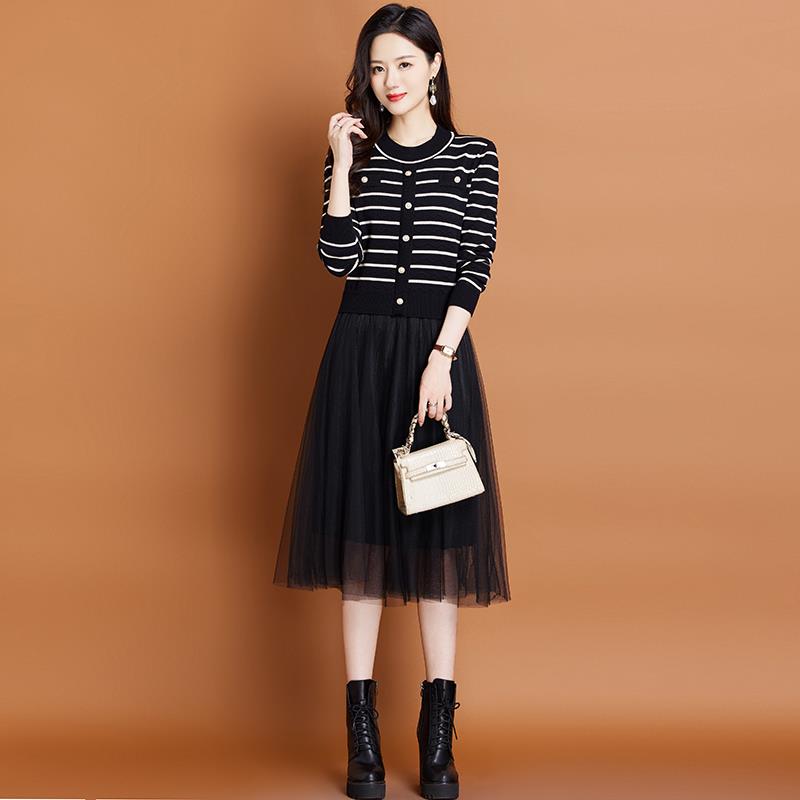 小香风条纹针织连衣裙女春秋2024新款收腰显瘦长款打底裙子中长款