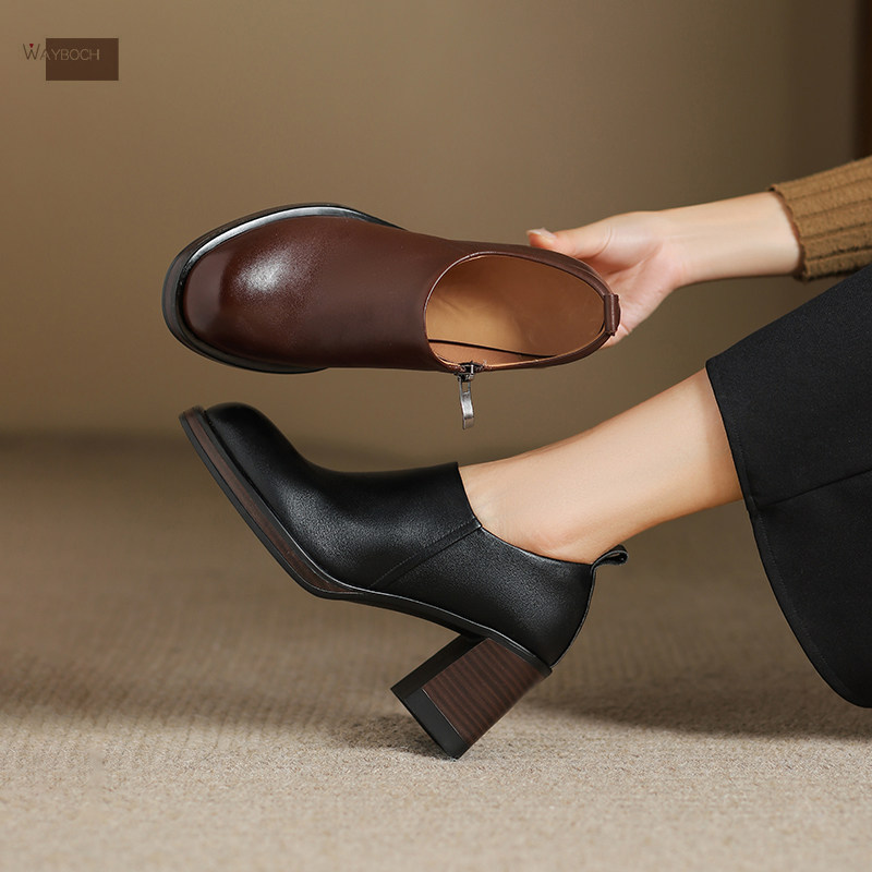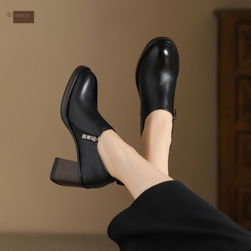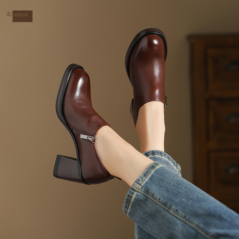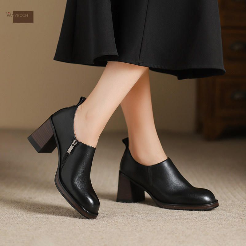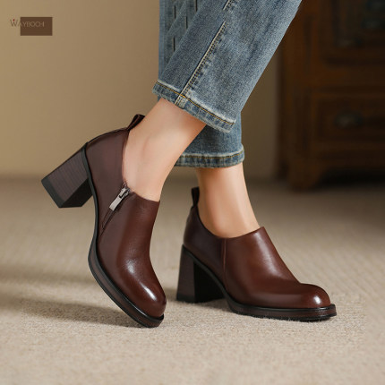 头层牛皮 防水台圆头粗跟高跟单鞋女 真皮深口秋季小皮鞋欧美通勤