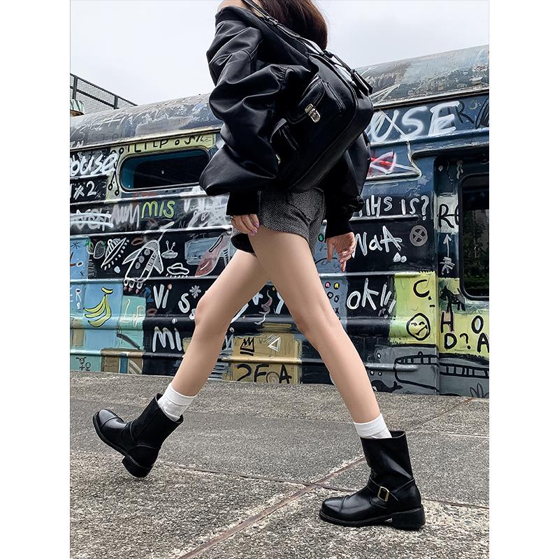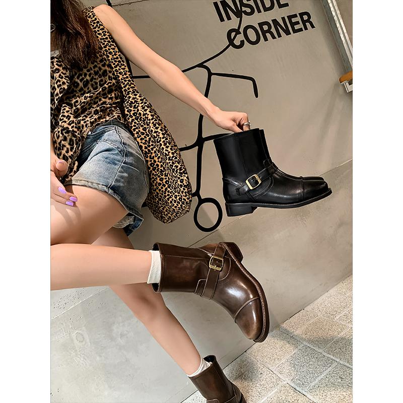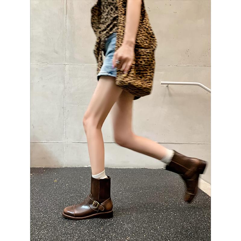 棕色复古皮带扣切尔西靴女洋气小短靴平底英伦风马丁靴超火机车靴