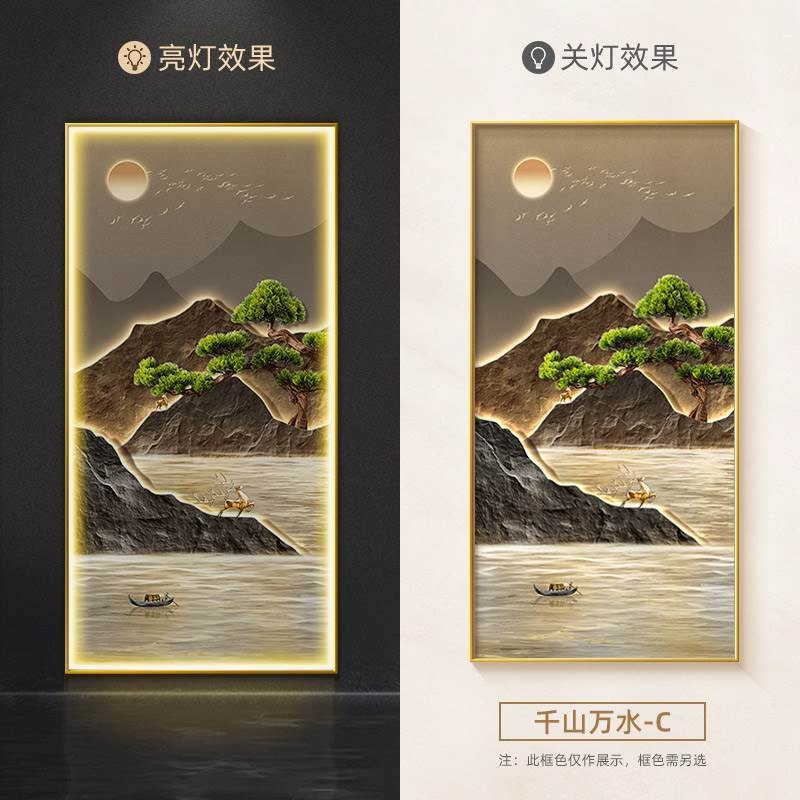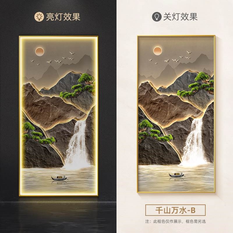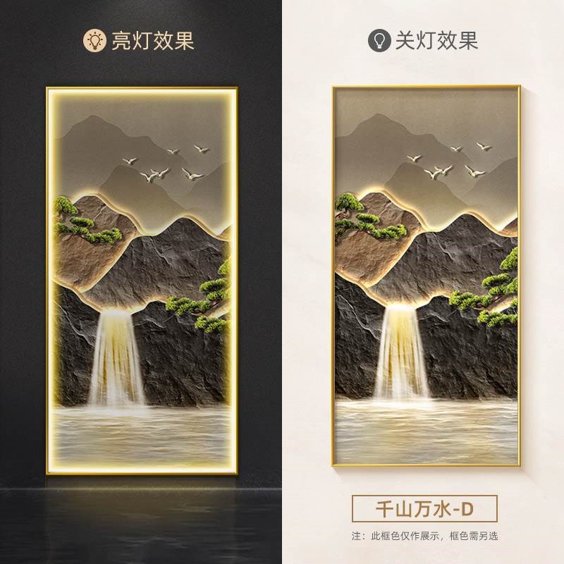 流水生财玄关装饰画迎客松入户门灯画新中式山水挂画竖版客厅壁画