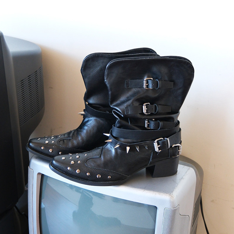 Moreyu褶皱西部短靴女铆钉骑士靴