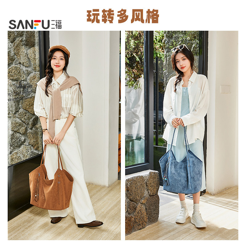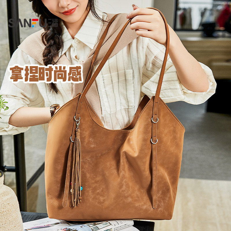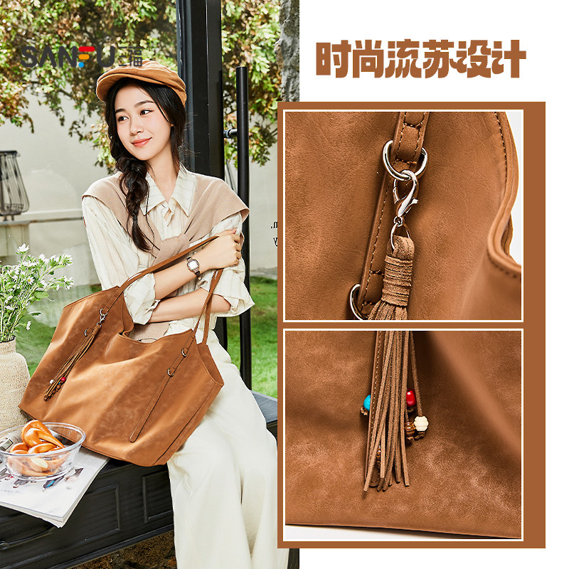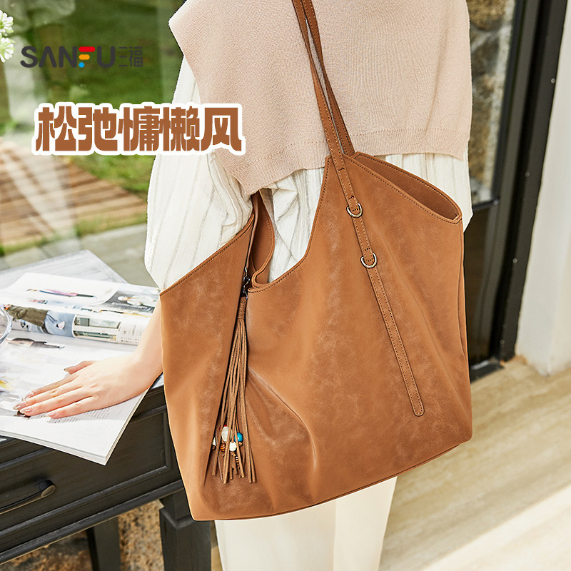 三福包包挎包春季慵懒简约纯色流苏大容量半定型托特包女包506817