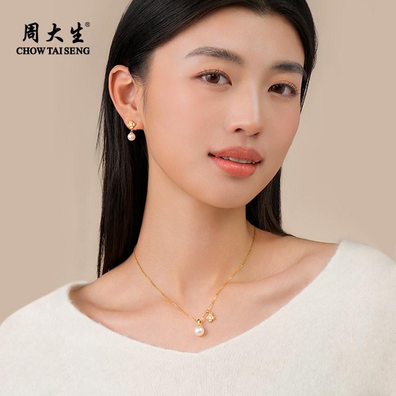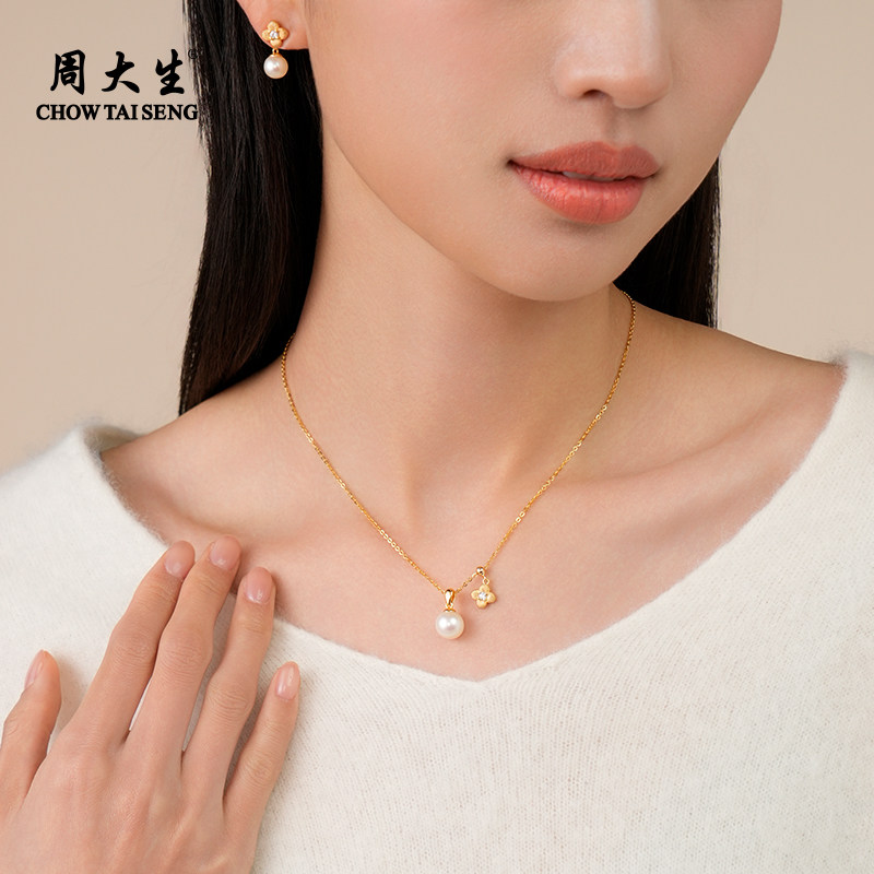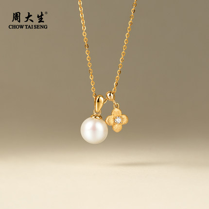 周大生拉丝海棠纹珍珠项链正圆强光淡水珍珠吊坠经典四叶草颈链