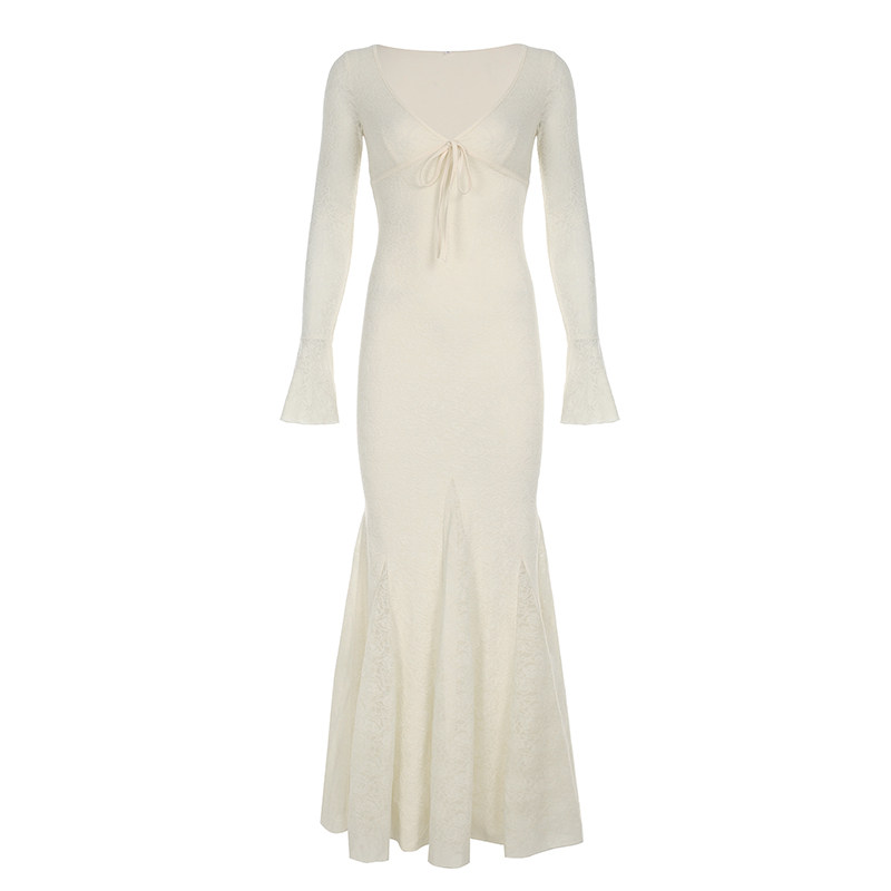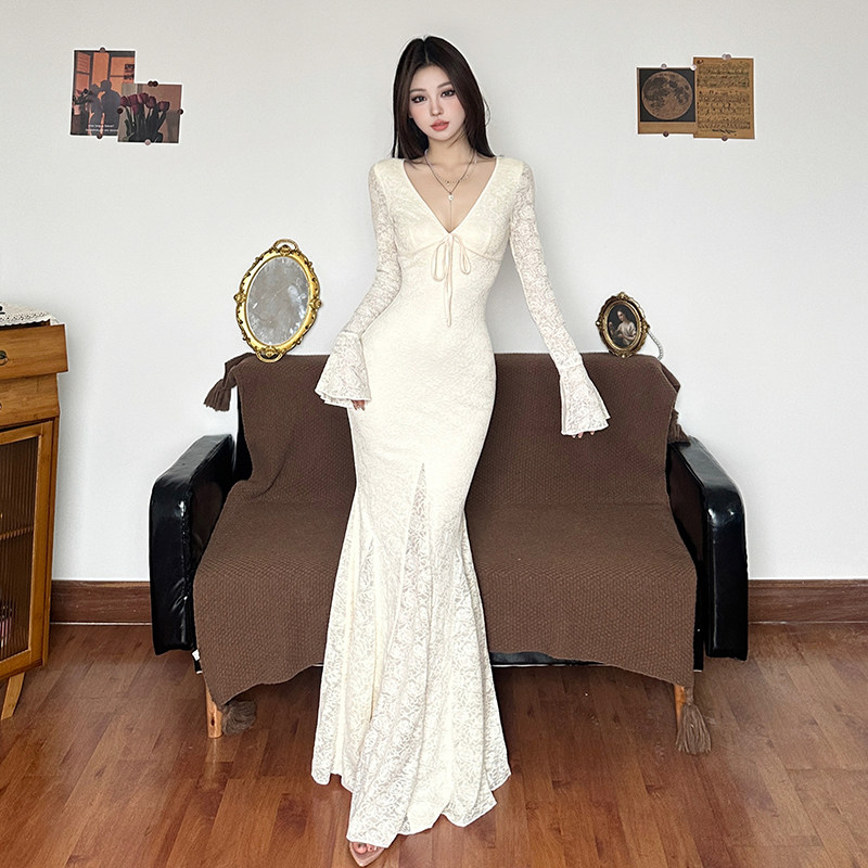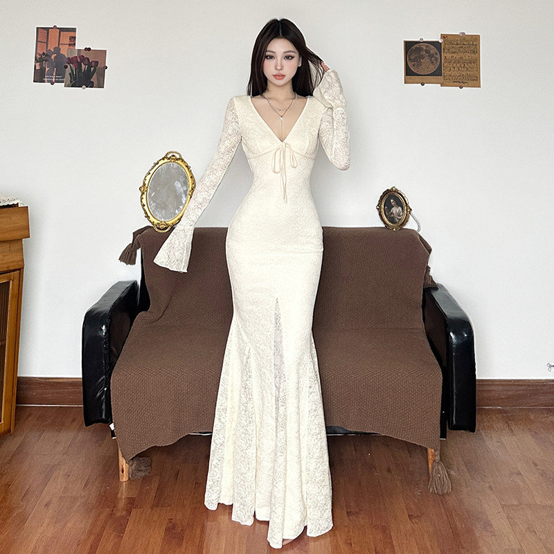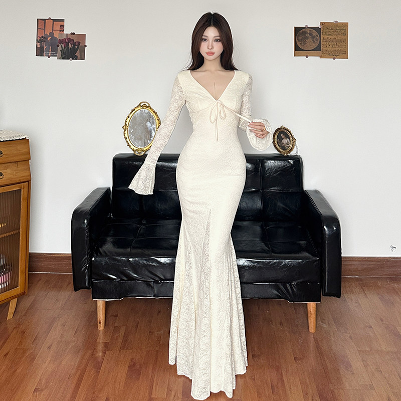 IAEY法式优雅~蕾丝钩花V领系带长袖连衣裙秋季收腰包臀鱼尾长裙潮