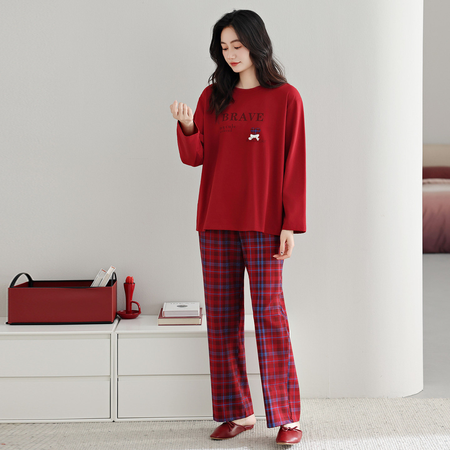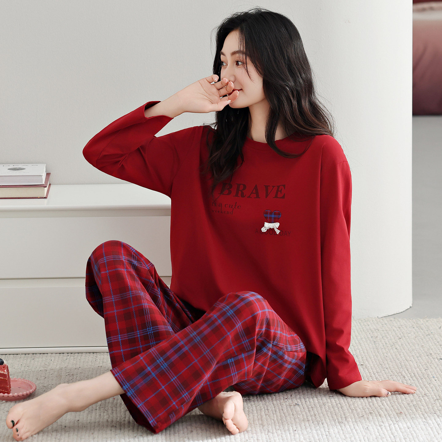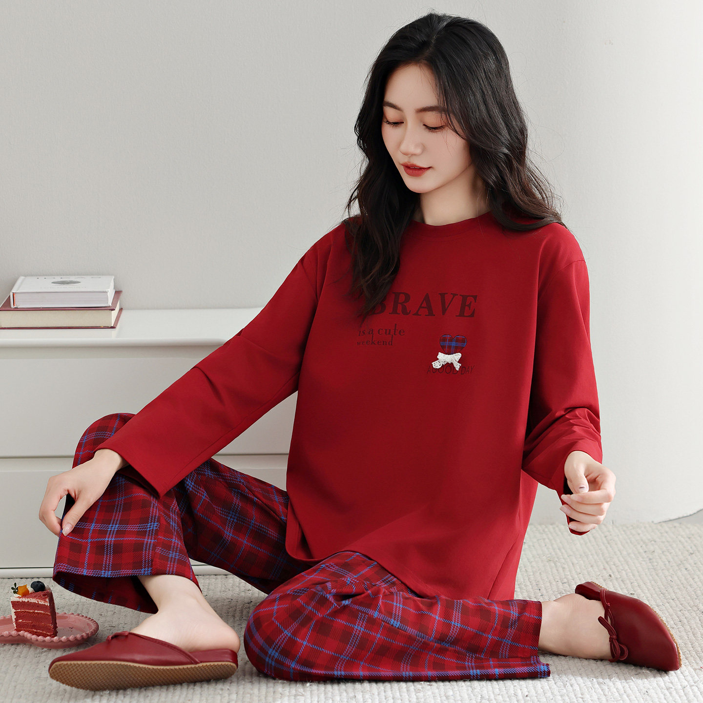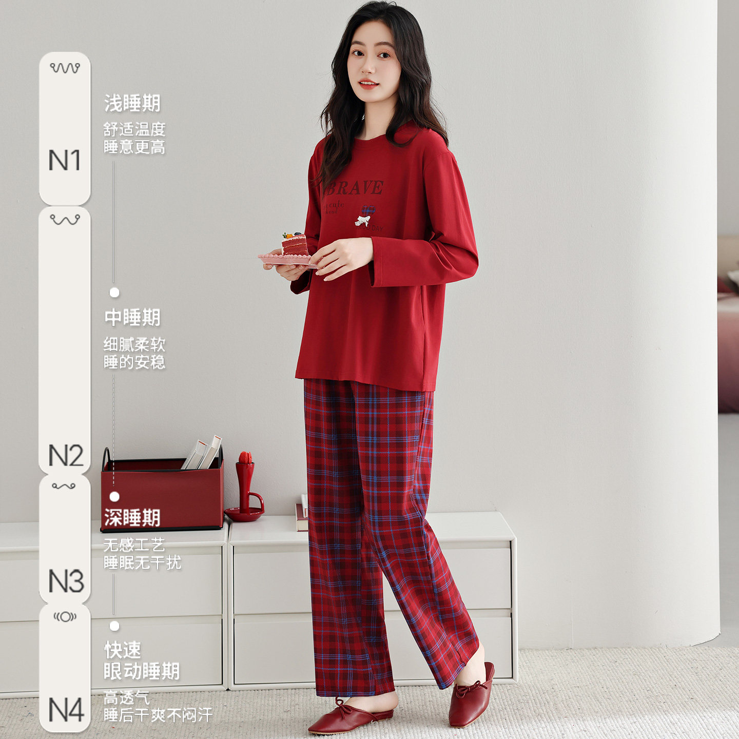 芬腾可安长袖睡衣女款秋冬款2026新款红色纯棉女士爱意家居服秋季