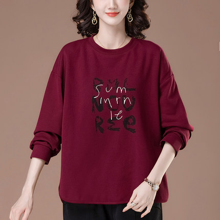 中老年妈妈春秋季长袖T恤宽松加肥加大码女装休闲印花显瘦打底衫