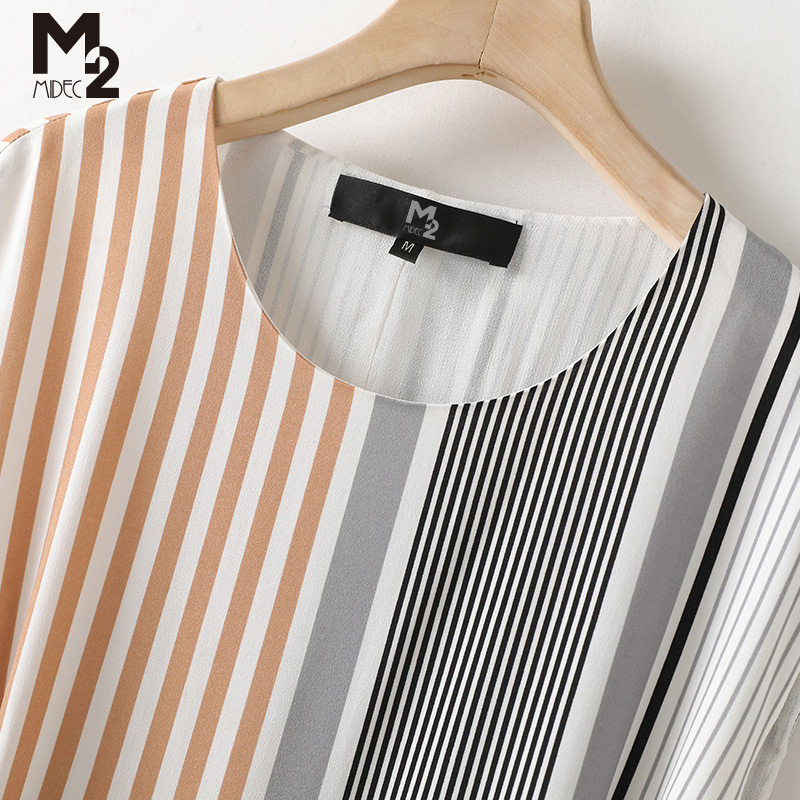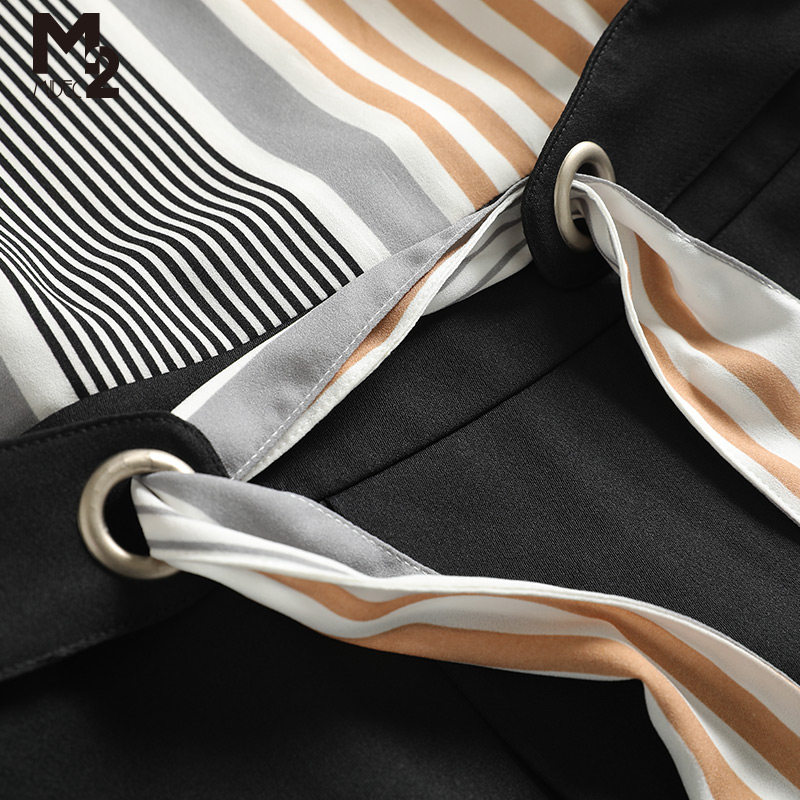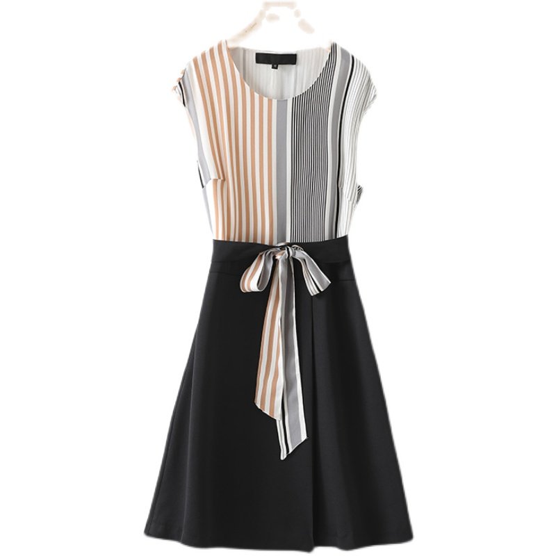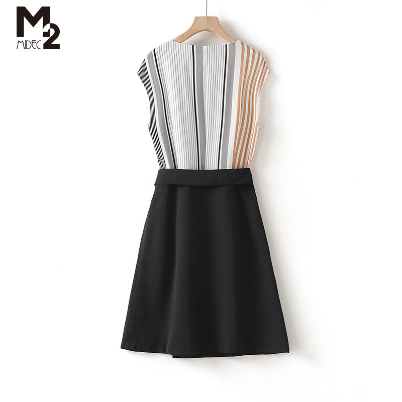 M2无袖圆领雪纺连衣裙中长款新款条纹收腰显瘦气质复古法式长裙女