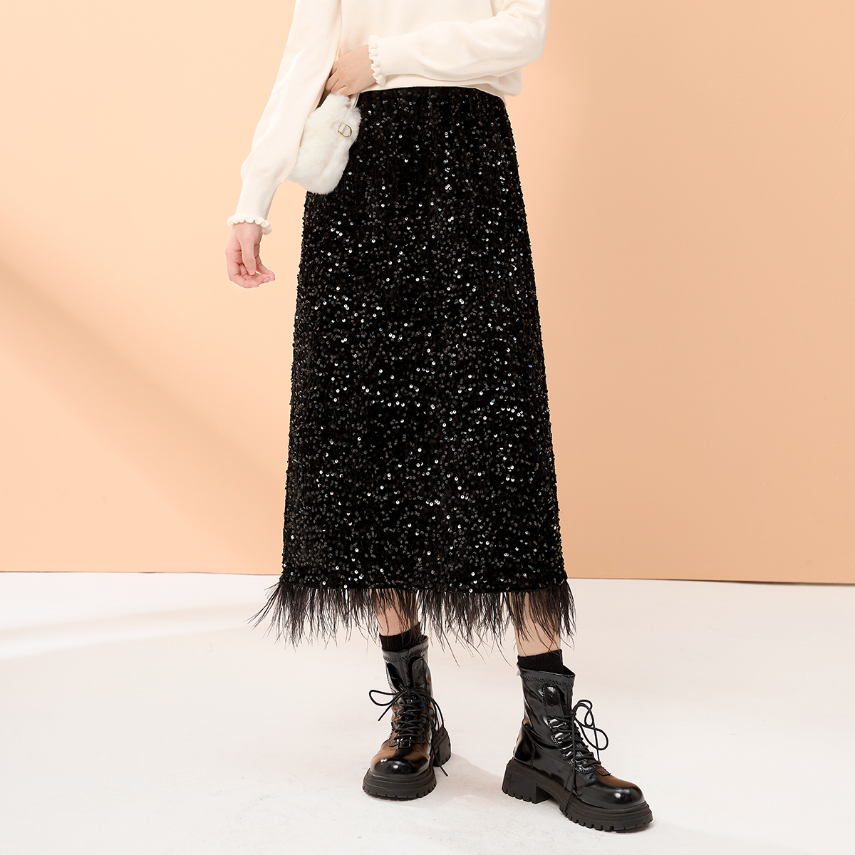 设计感重工亮片高腰半身裙