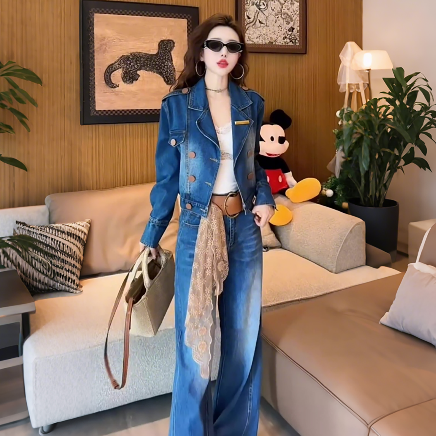 春秋季新款显瘦牛仔套装女2025欧货时尚休闲短款外套阔腿裤两件套