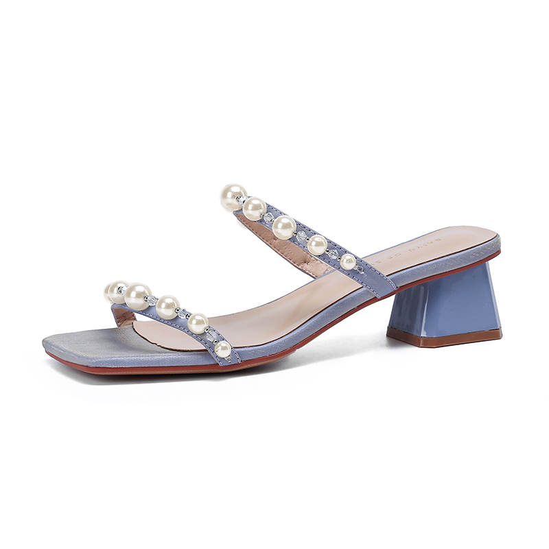 法式珍珠一字带粗跟外穿凉拖鞋女