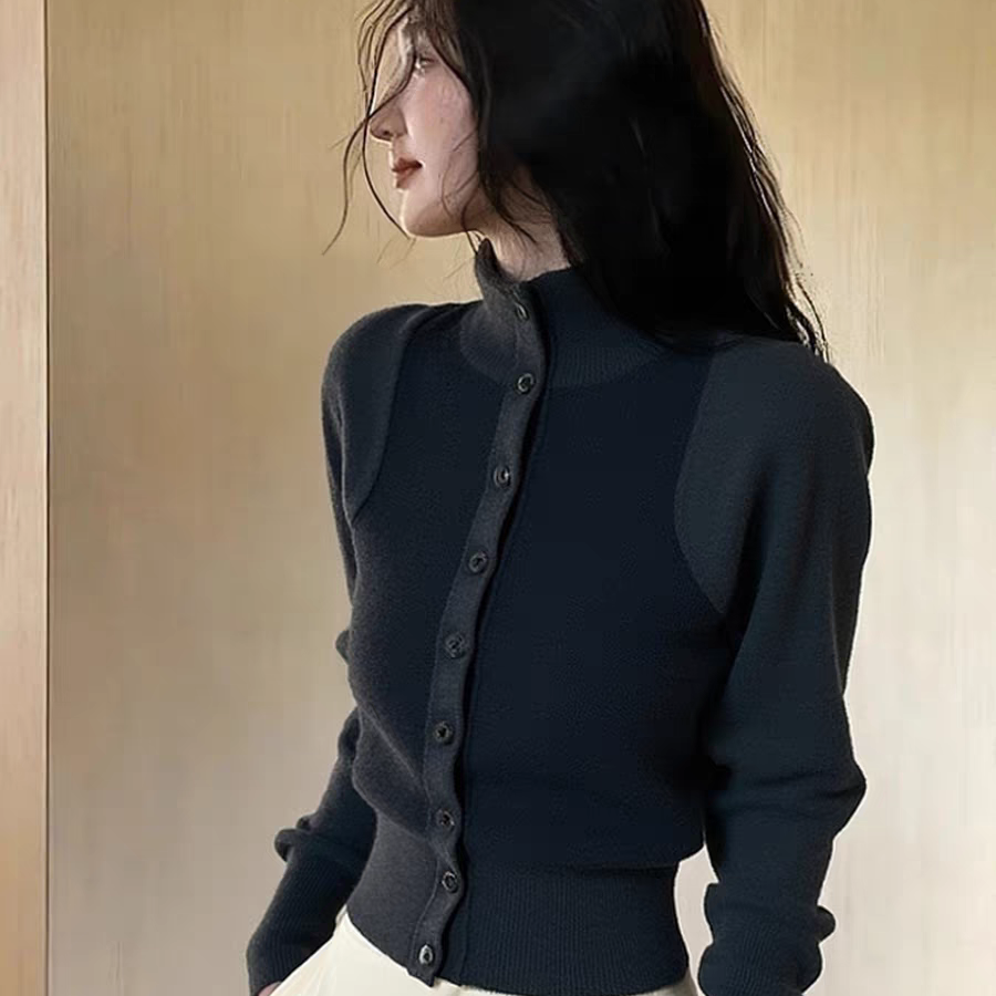 毛衣女款2025新款独特别致巨好看收腰气质灰色撞色高领针织上衣冬