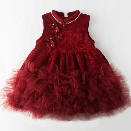 女童旗袍裙秋冬裙子新年红色背心裙儿童加绒马甲裙洋气公主裙纱裙