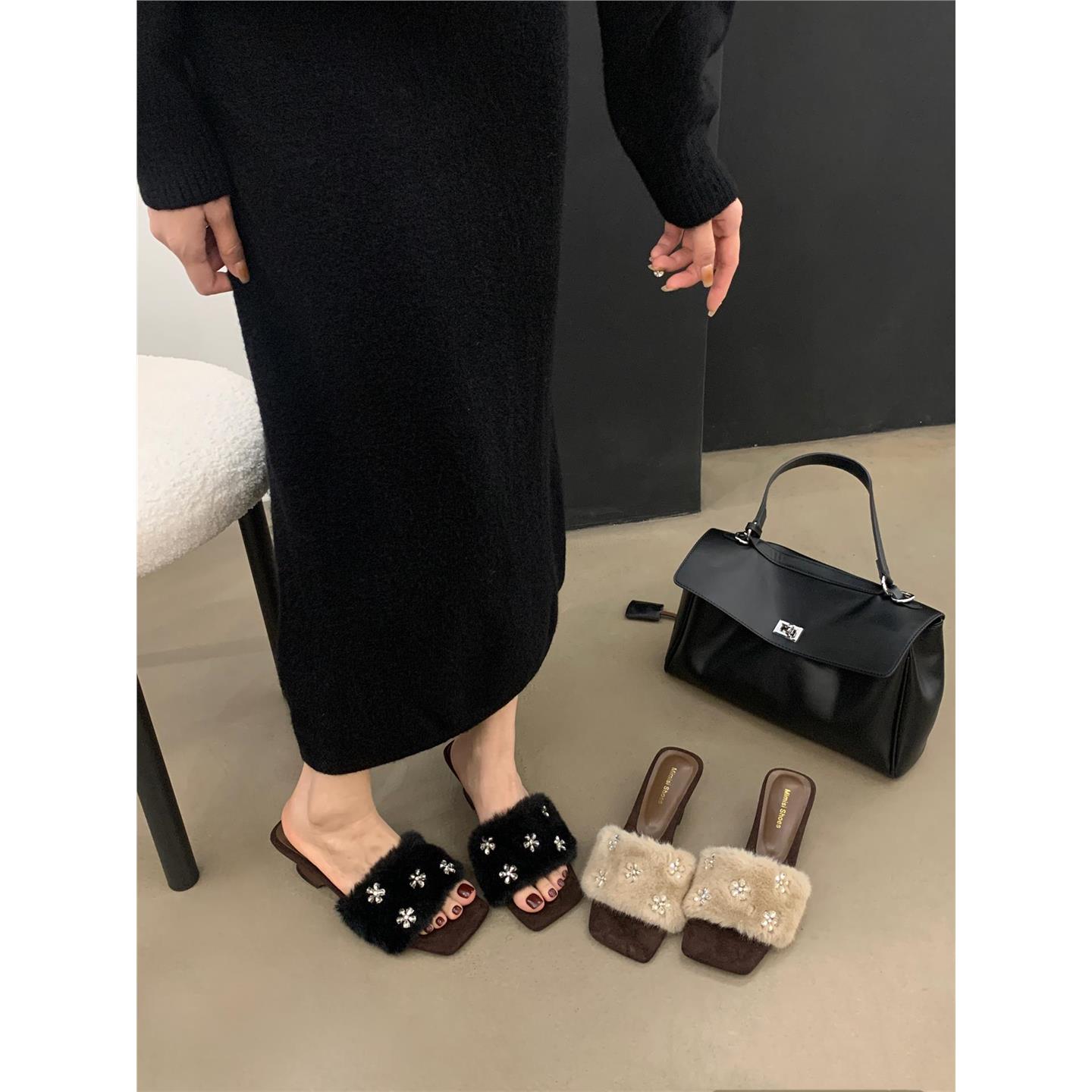 2025秋新款时髦方头高跟一字拖外穿水钻毛毛鞋坡跟中跟露趾女拖鞋