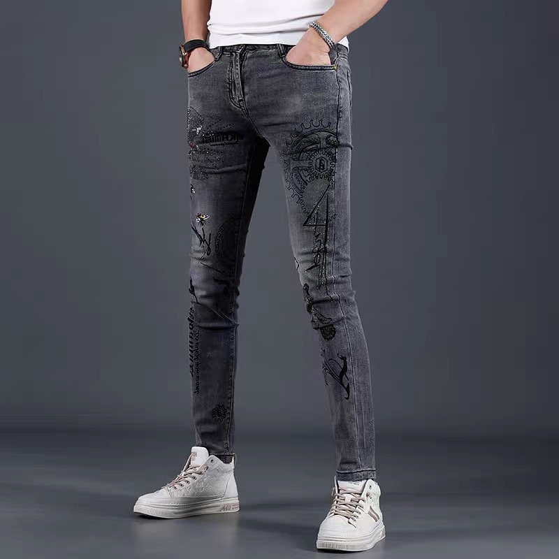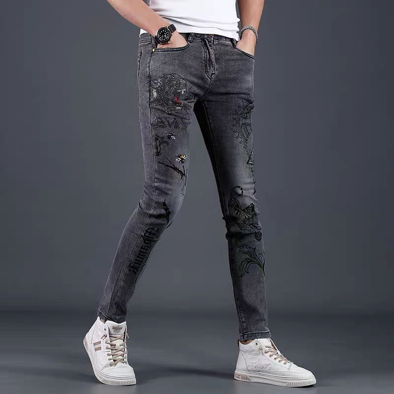 欧洲站高端潮牌加绒加厚牛仔裤男重工老虎烫钻潮流修身弹力小脚裤